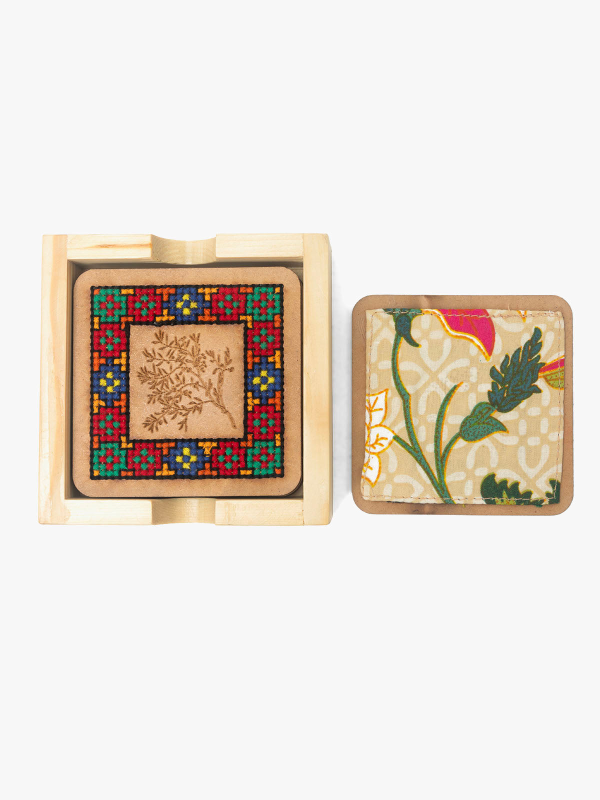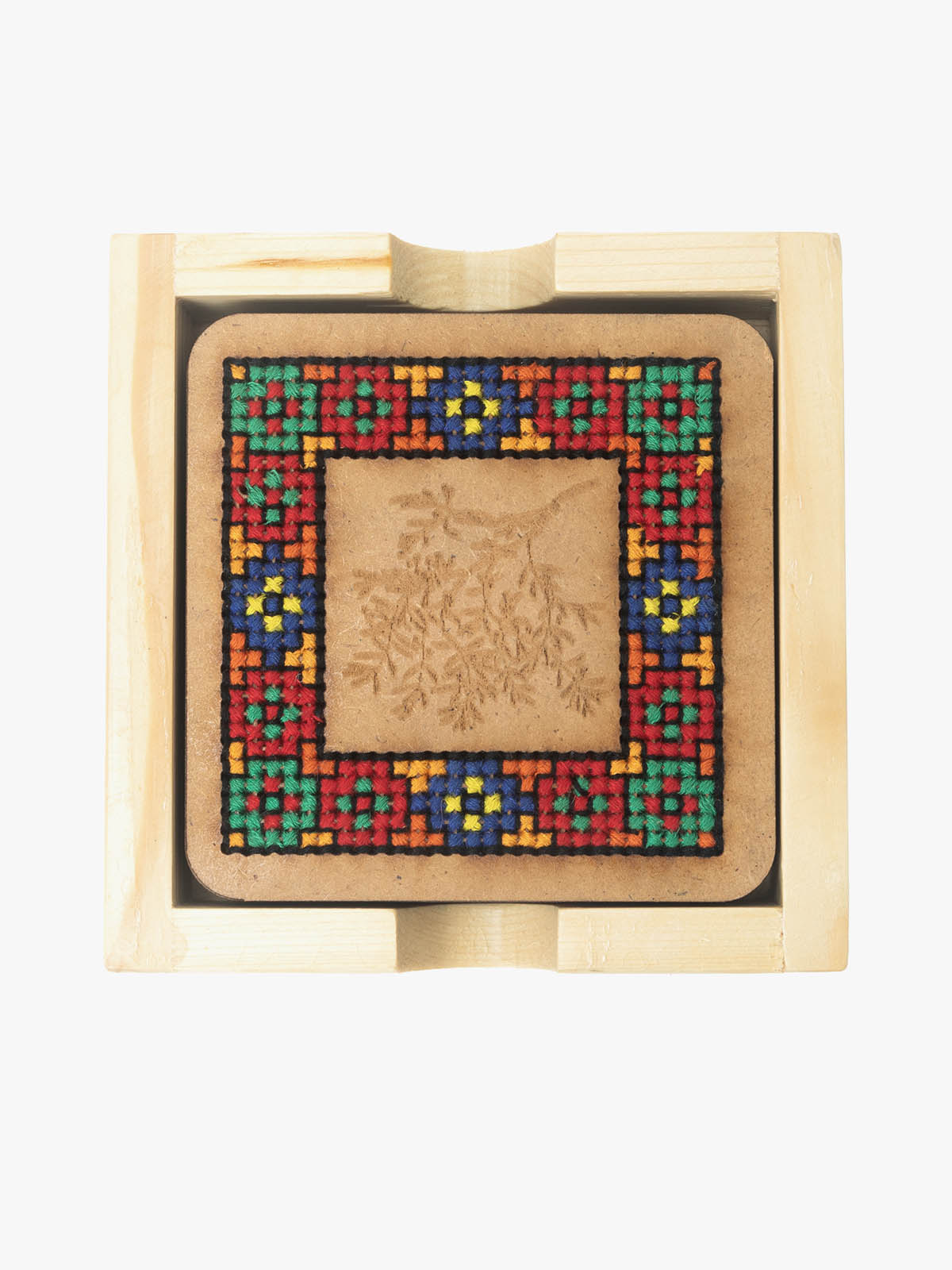 The Wooden Coaster is a stylish and practical addition to any table or surface. Crafted from high quality wood. It combines natural beauty with Cross stitch. The coaster Provides a stable base for drinks, Protecting your furniture from stains and marks. Its minimalist design and earthy tones bring a touch of elegance to your home decor.