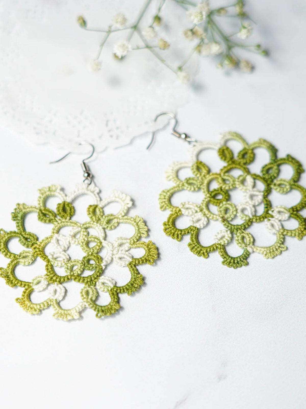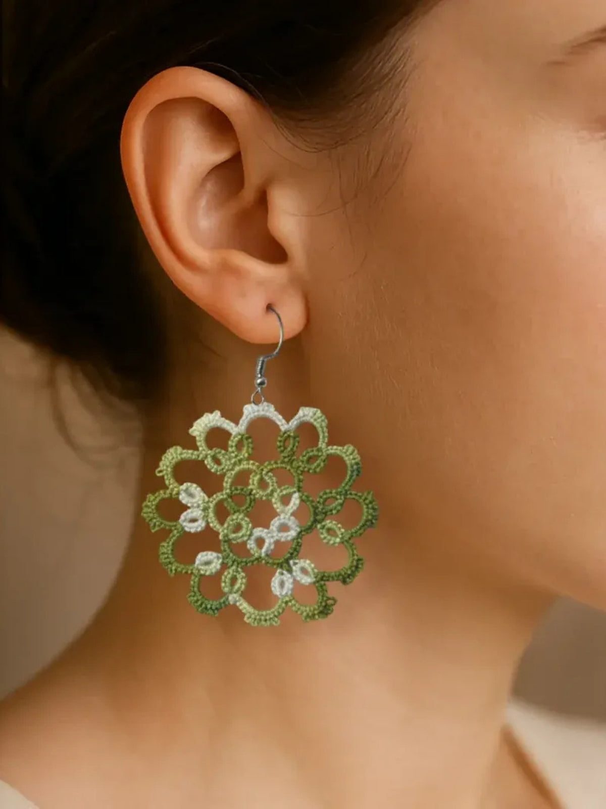 Beautifully crafted with cotton thread using the age-old technique of tatting, these earrings feature intricate lacework created stitch by stitch with shuttle tatting. Handmade with great care, each pair is exclusively crafted using this traditional method. As artisanal items entirely made and decorated by hand, small imperfections denote the originality of the product.