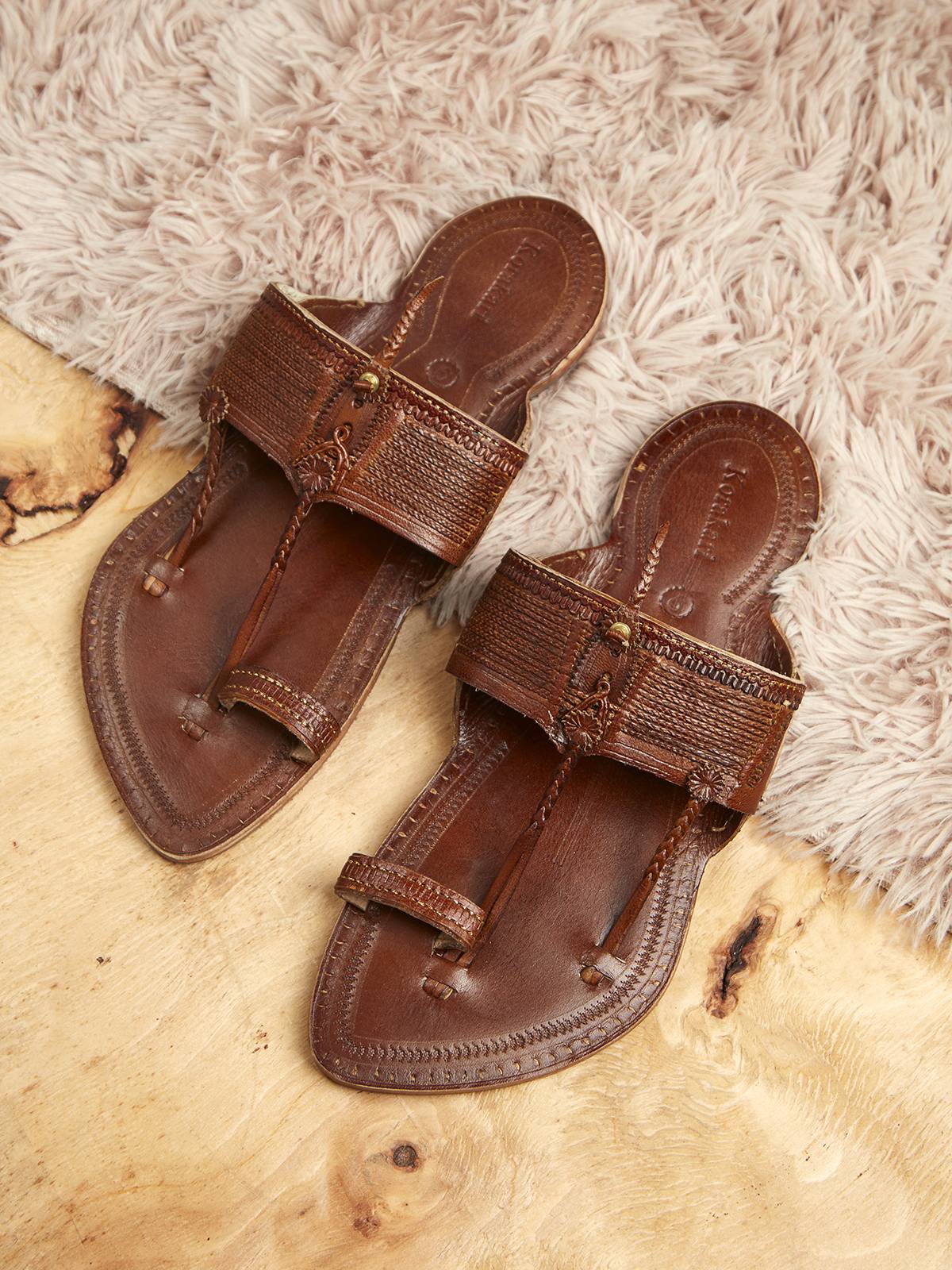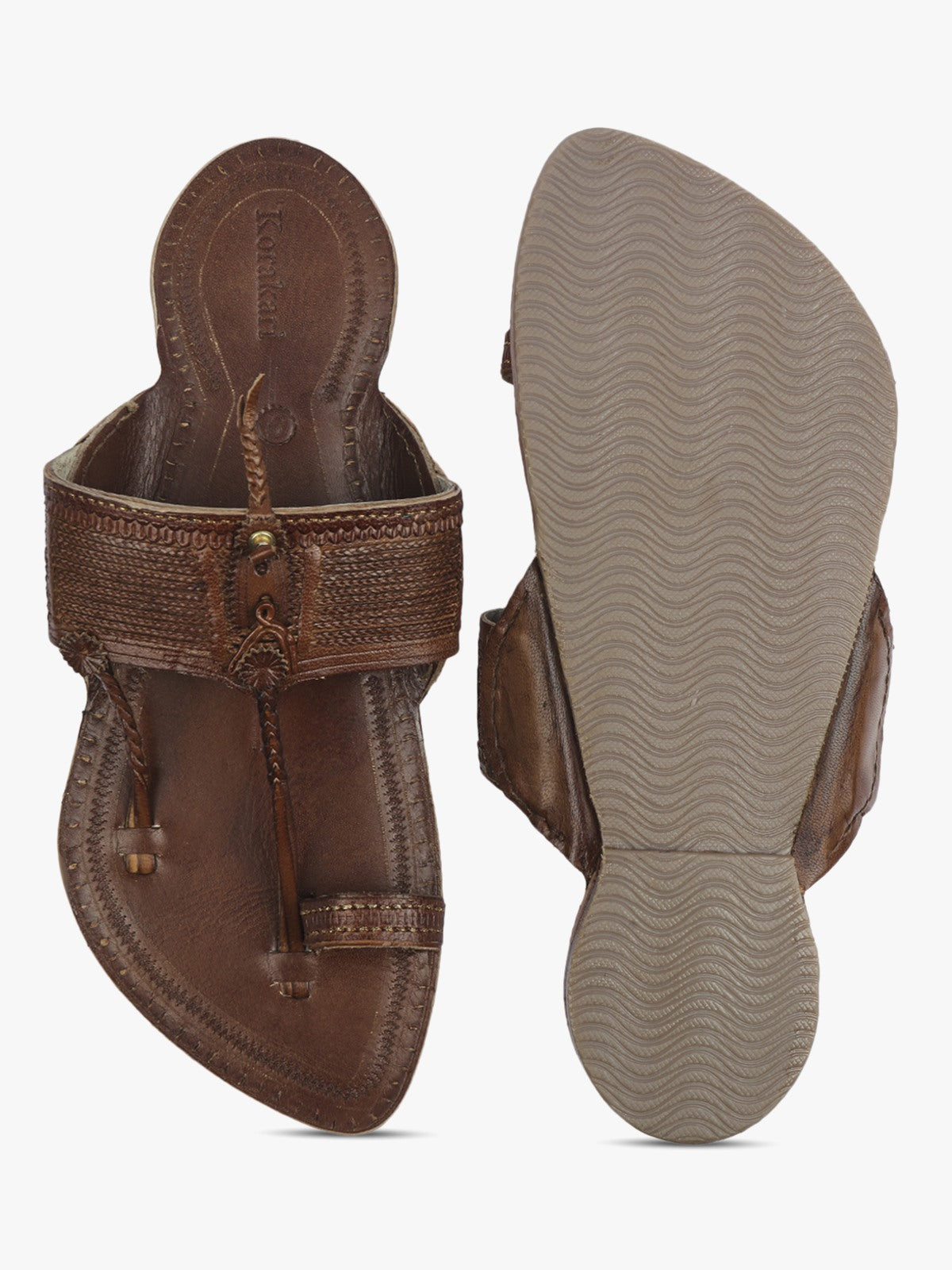 Authentic Tan Kolhapuri Chappal for Men With Twelve Fine Leather Braids on Upper, Kapshi Shape, Manual Leather Chord Stitchin, Cushioned Bottom and Anti Slip Full TPR at Bottom.