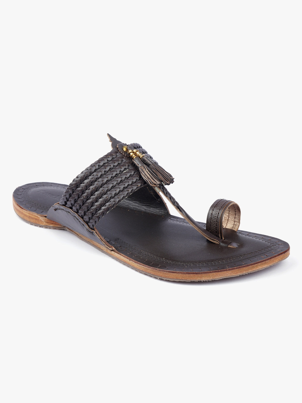 The Chic by Korakari - Men's Dark Brown Kolhapuri Chappal with Six Braided and Pom-pom Upper, Kapshi Shape, Cushioned Bottom with Manual Leather Chord Stitching and Anti-Slip TPR at Bottom.