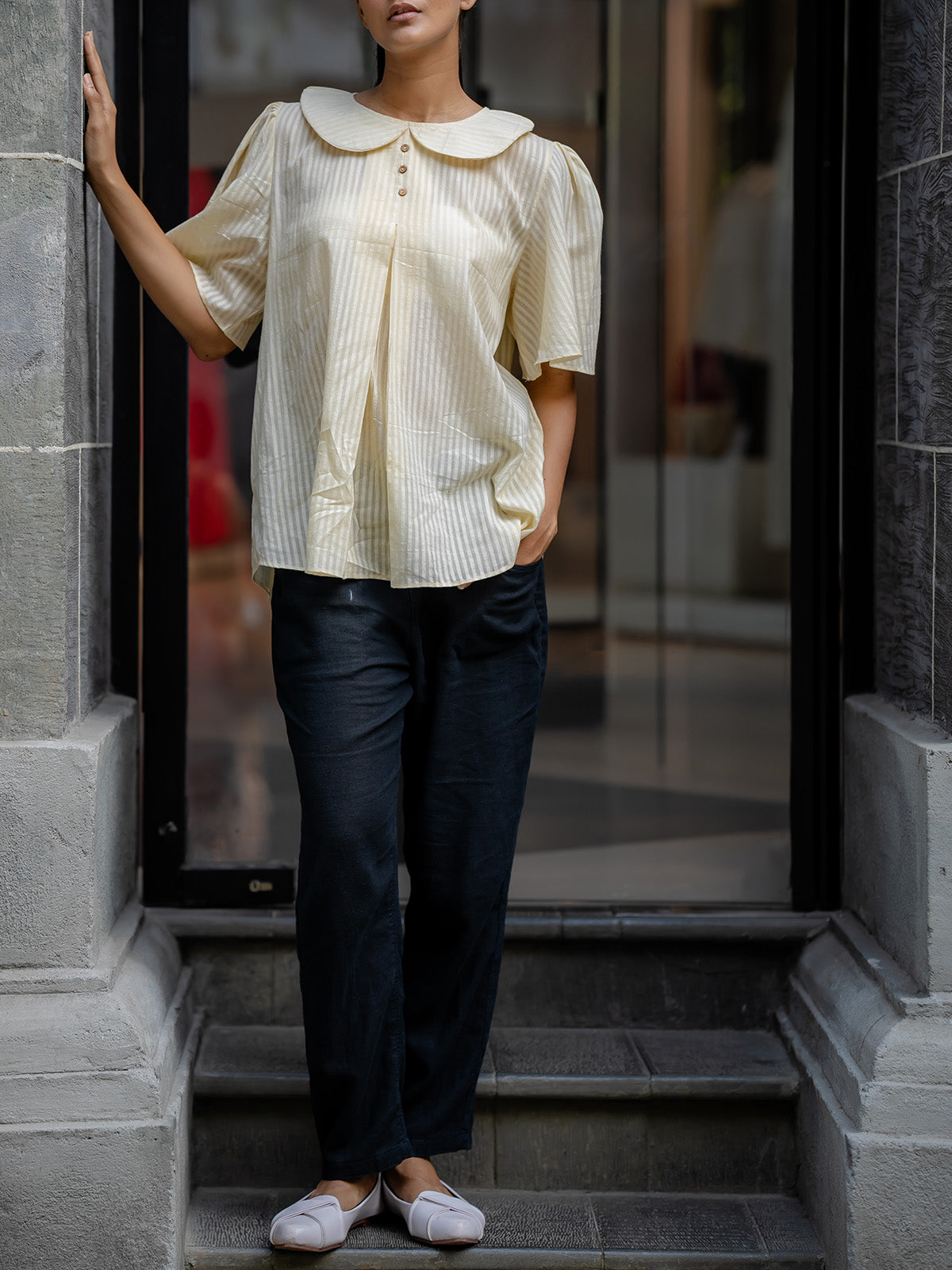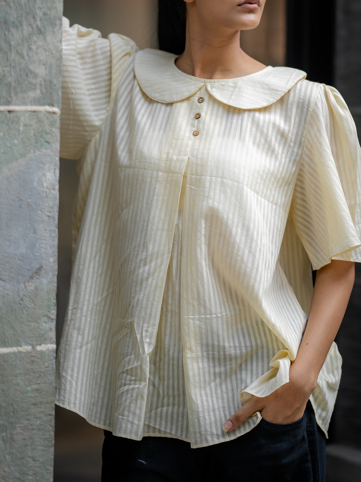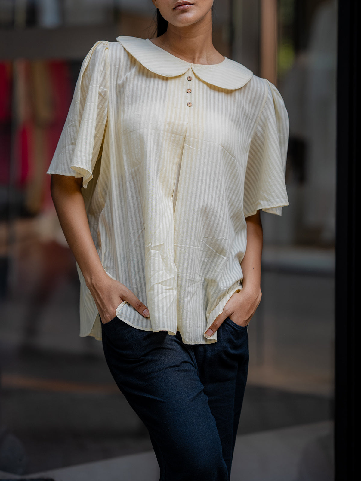 Introduce a touch of classic charm to your collection with the Cream-Colored Striped Shirt. This short-sleeved, button-up shirt features a unique sailor-style collar and subtle vertical stripes, offering a playful yet sophisticated look. The relaxed, boxy cut ensures a comfortable fit, while the cuffed sleeves add a polished finish. Ideal for a casual yet stylish ensemble, this shirt is a versatile piece for any fashion-forward wardrobe.