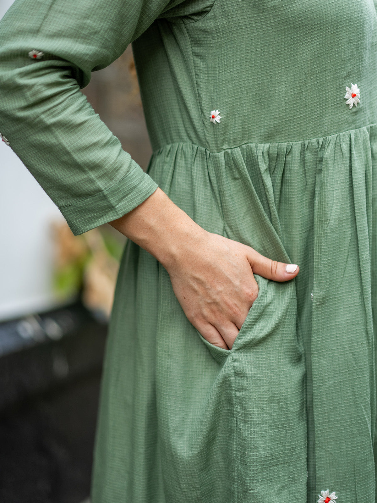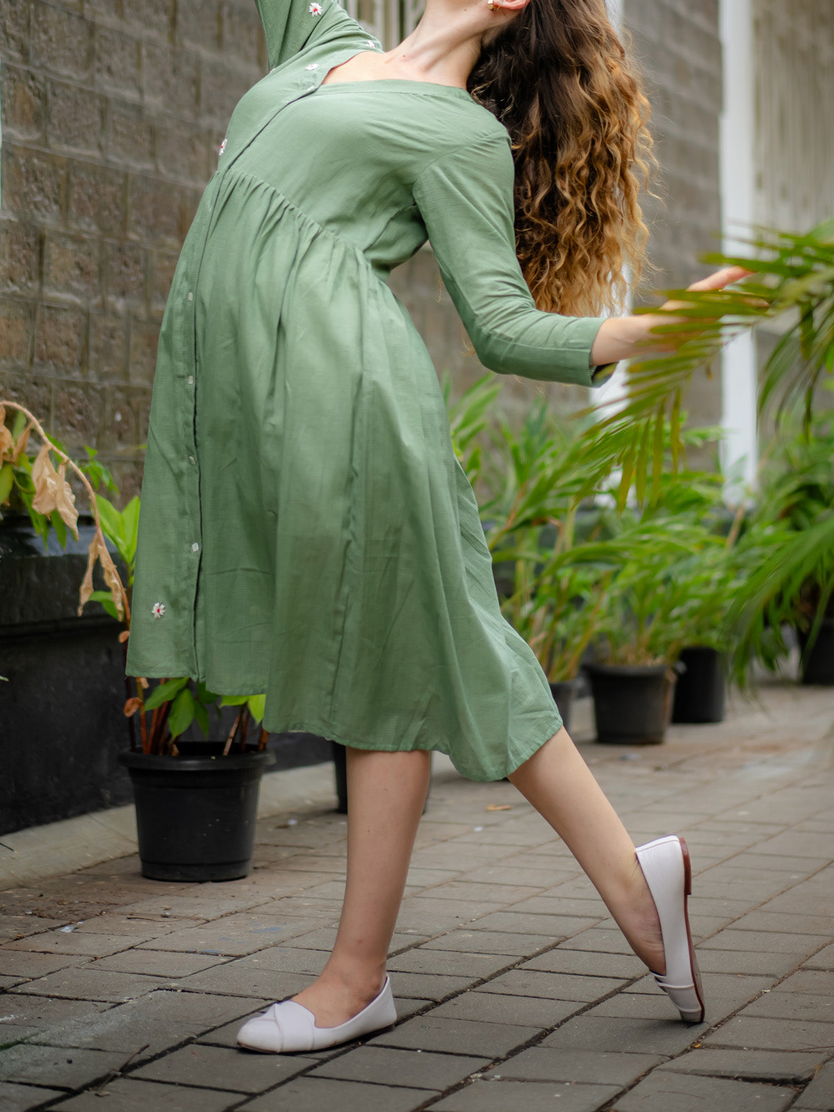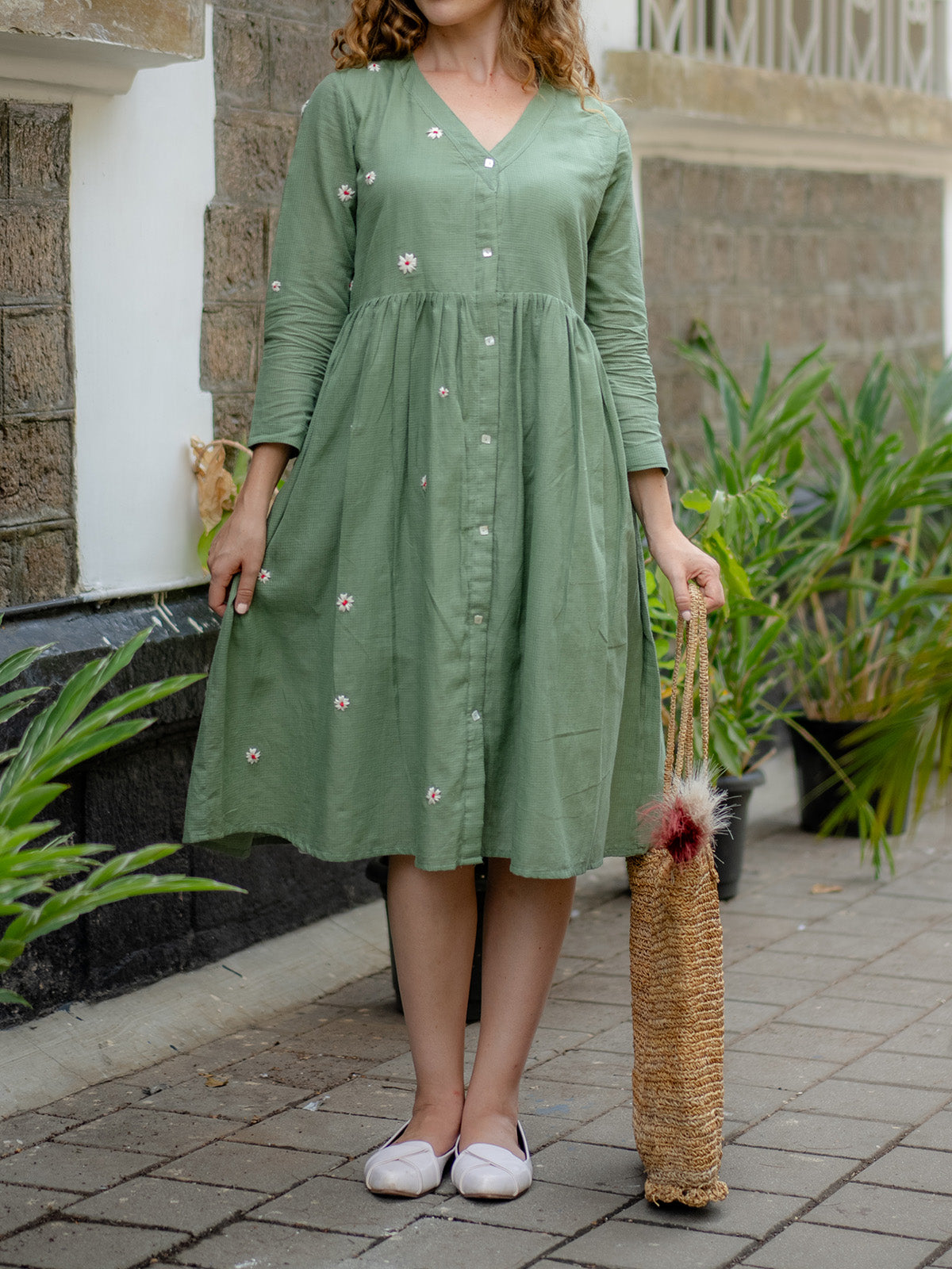 Immerse yourself in the natural elegance of the Shiuli Dress. This piece, crafted from the finest handloom fabric, features a flattering V-neck cut and three-quarter length sleeves, perfect for transitioning through seasons. The mid-calf hemline and front button details add a classic touch, while the gathered waist creates a gentle flare, accentuating any figure with grace. This dress is a versatile and stylish choice for those who value sustainable fashion and timeless design.