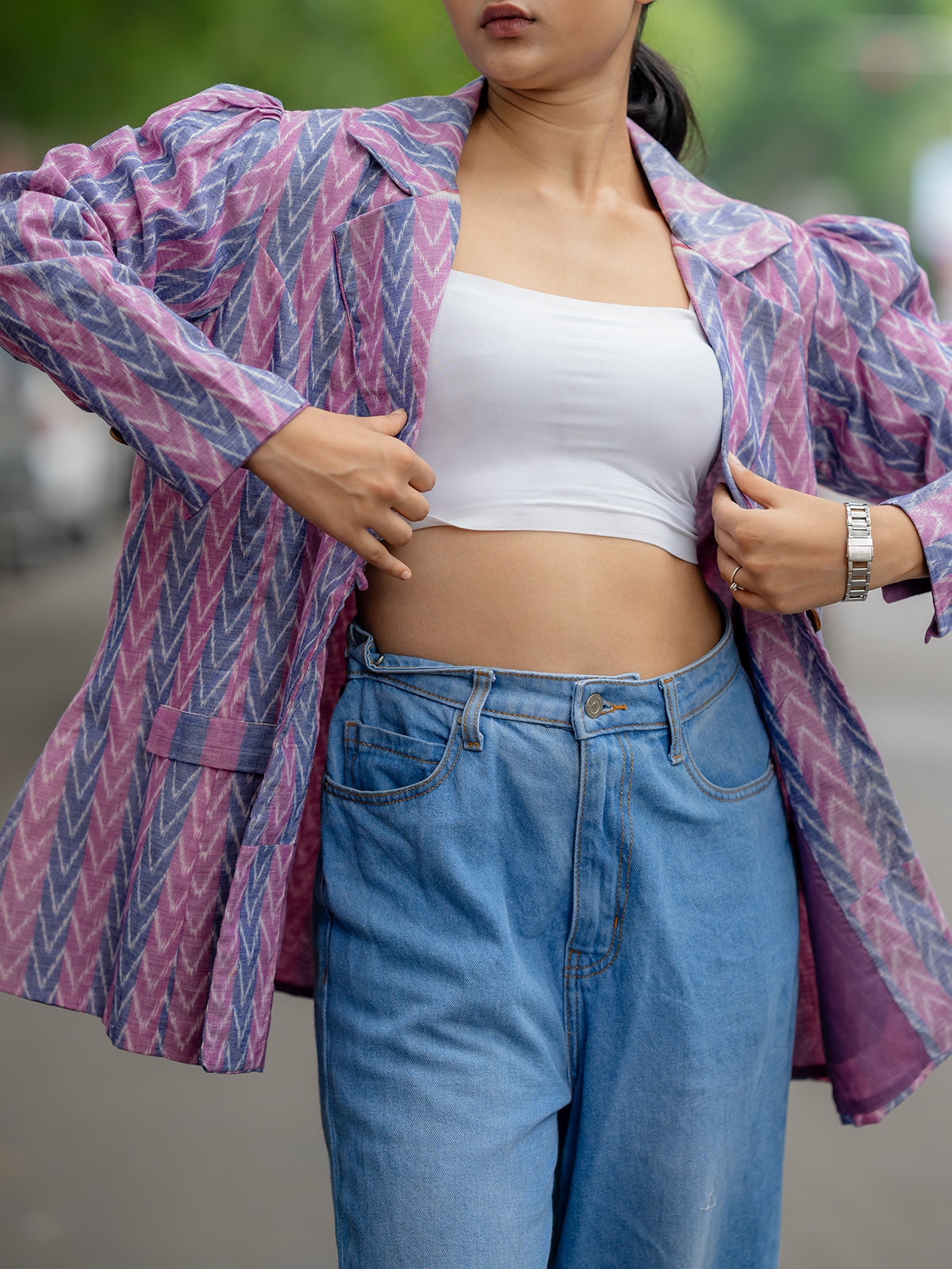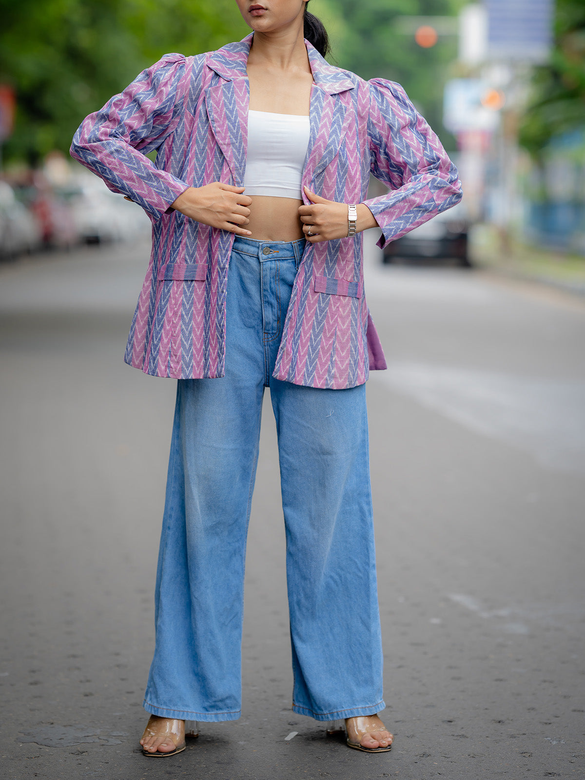 Discover the Mixed Candy Jacket, a sustainable marvel in our collection. This handwoven Ikat blazer, authentically crafted in India, features a single wooden button and convenient pockets. Elevate your style with its chic puffed sleeves, blending comfort with distinctive flair. Chase comfort and express your unique style with this standout piece.