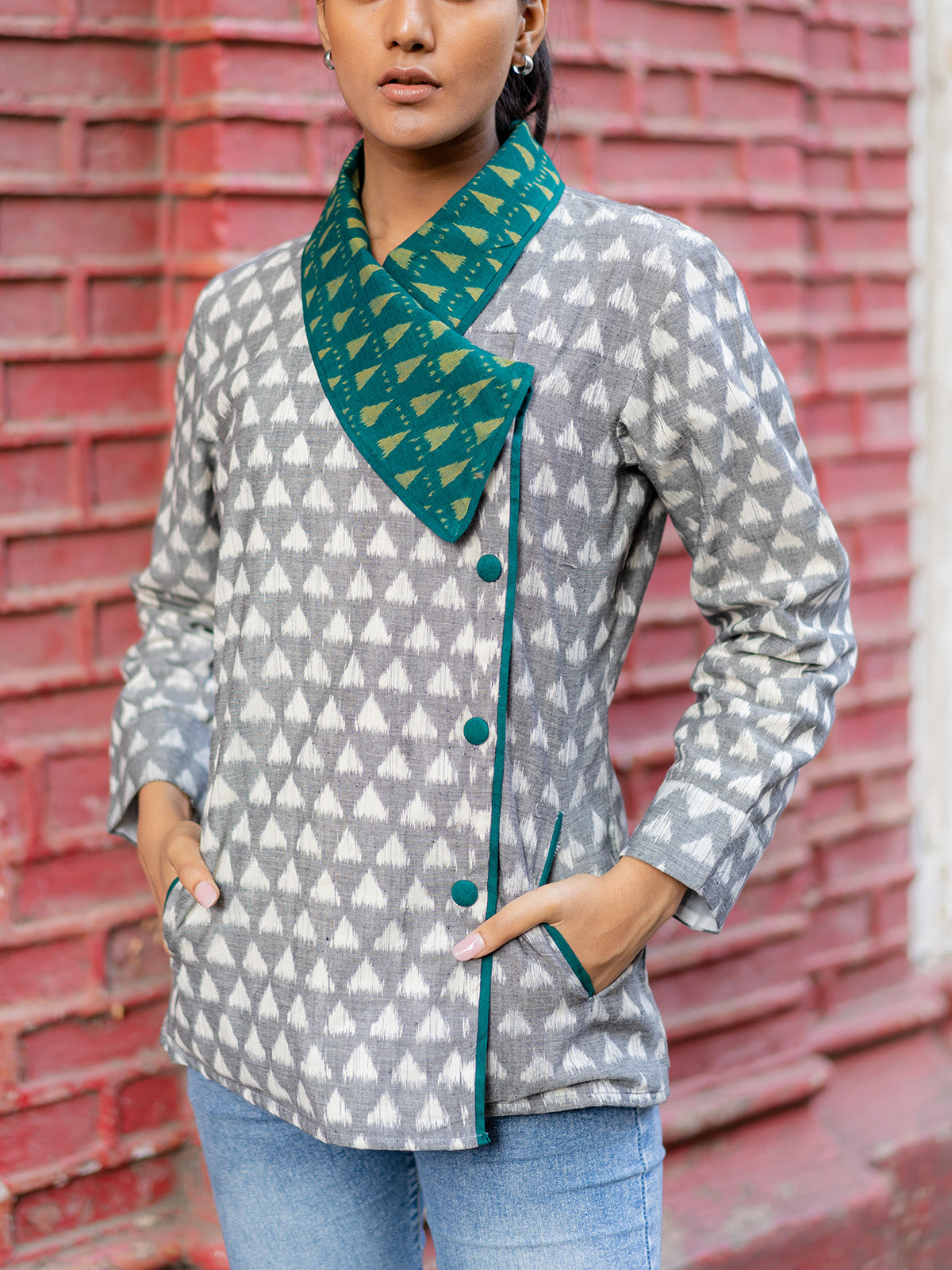 Indulge in eco-friendly style with the Shades of Nature Jacket in Grey, crafted in India from premium Ikat cotton from Odisha. This sustainable jacket features a shawl collar, fabric buttons, and three layers of lining for cozy comfort. Its contrasting collar and buttons add a standout touch, making it perfect for any occasion.