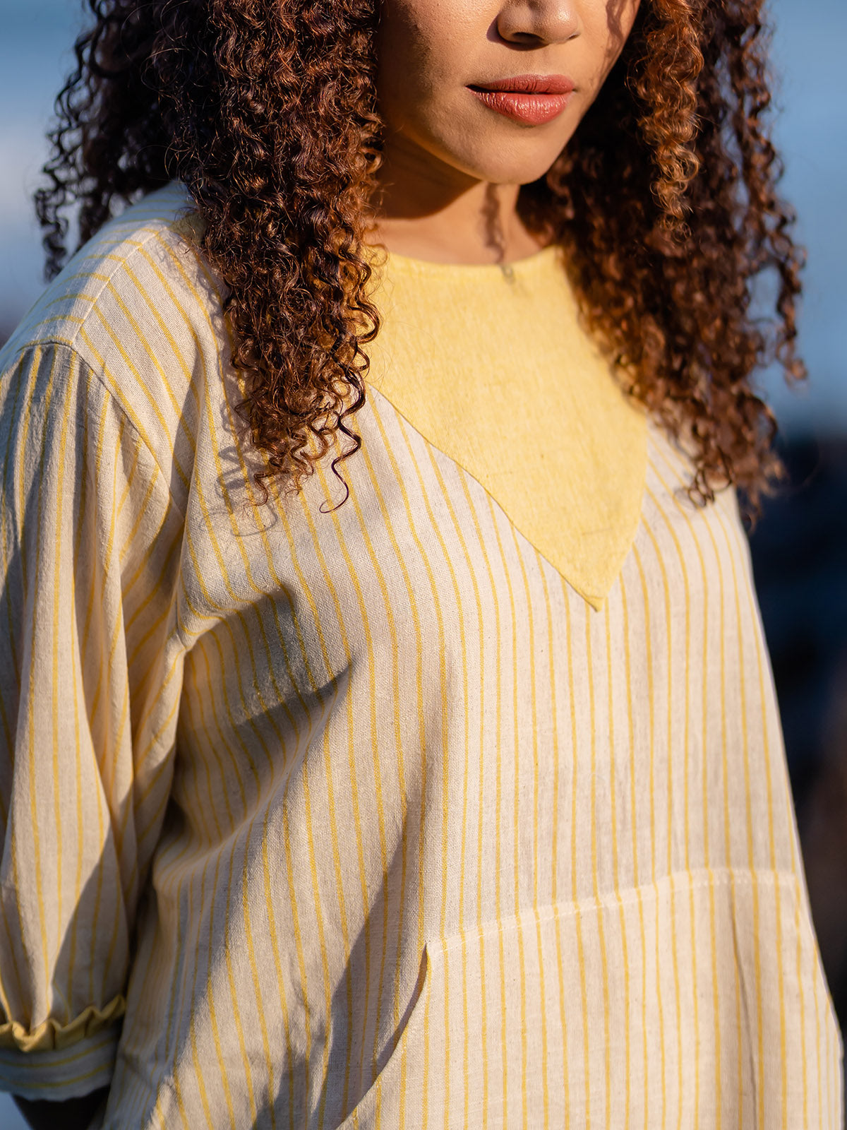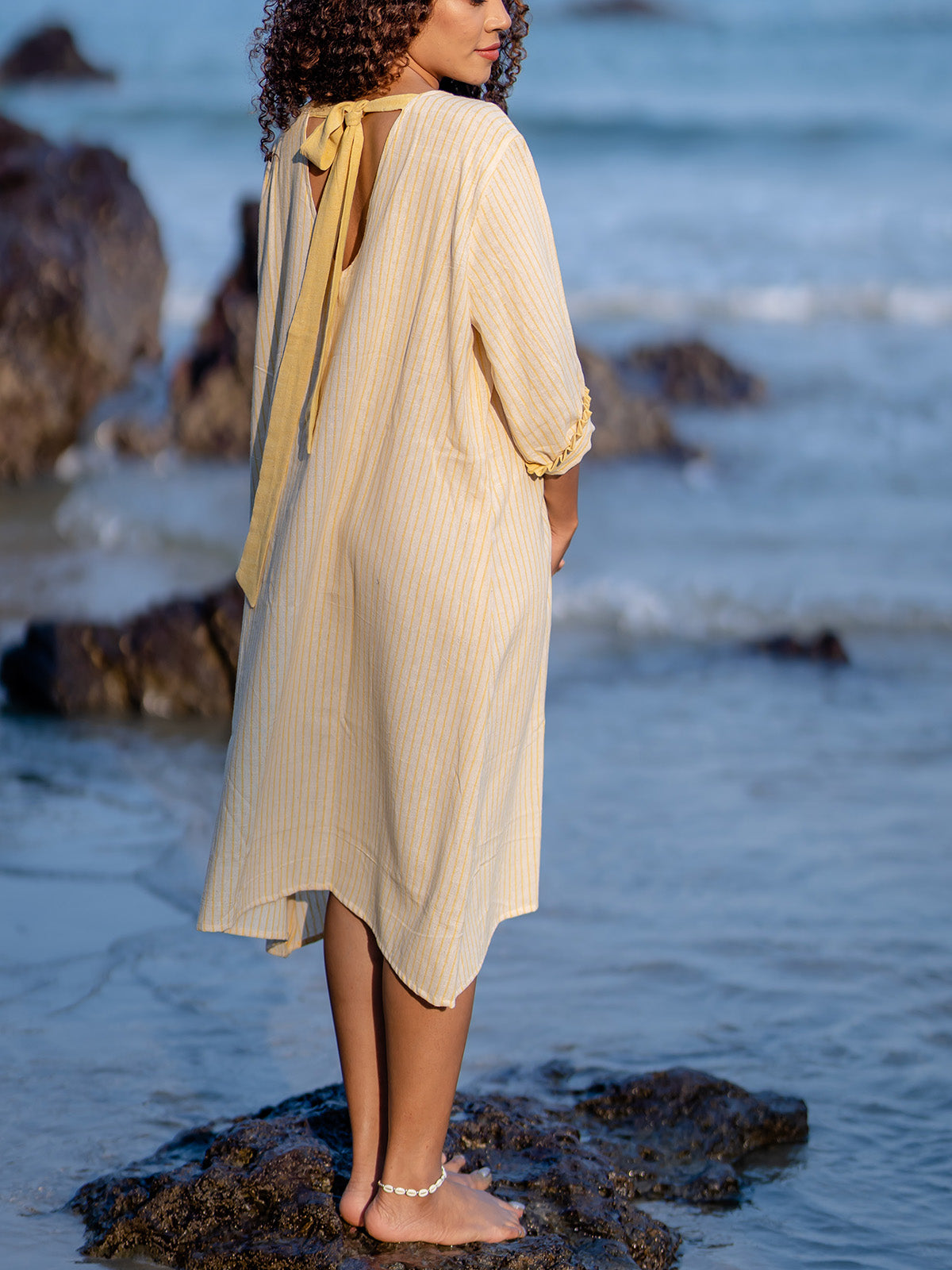 "Radiate the warmth of summer in the Yellow Turmeric Dye Handloom Dress, reminiscent of a Tequila Sunrise. Crafted in India with sustainable materials, this vibrant piece is dyed from turmeric root, bringing natural beauty to your wardrobe. Embrace playful elegance with contrast ruffles, side pockets, rolled-up sleeves, a stylish belt, and an asymmetrical hem. Let this dress become your go-to for a lively and sustainable fashion statement that captures the essence of sunny Working Days."