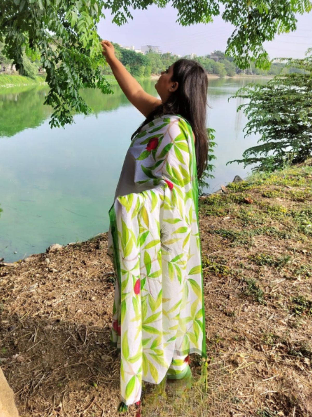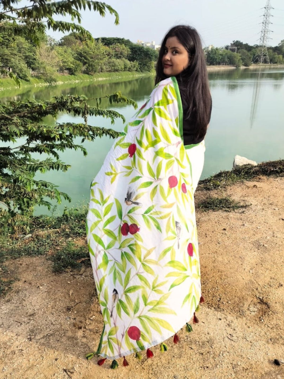 Inspired by the lush pomegranate orchards of India, this saree showcases exquisite hand-painted artistry in bold, celebratory tones. Each motif reflects the cultural heritage and natural abundance that define Indian textile traditions, making it a sophisticated choice for those who appreciate authentic craftsmanship and timeless elegance.