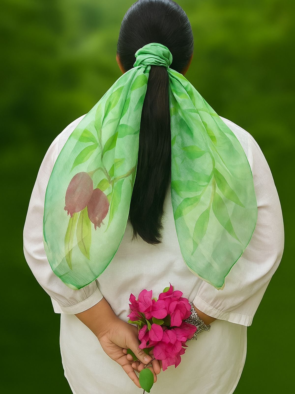 Inspired by the pomegranate's symbolic richness, this hand-painted scarf captures the essence of Indian craftsmanship through its bold, celebratory palette. Each piece reflects traditional artistry while conveying themes of prosperity, elegance, and joyful occasion—a versatile accessory that honors cultural heritage with contemporary appeal.