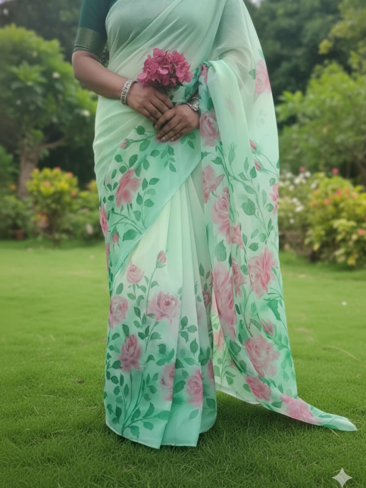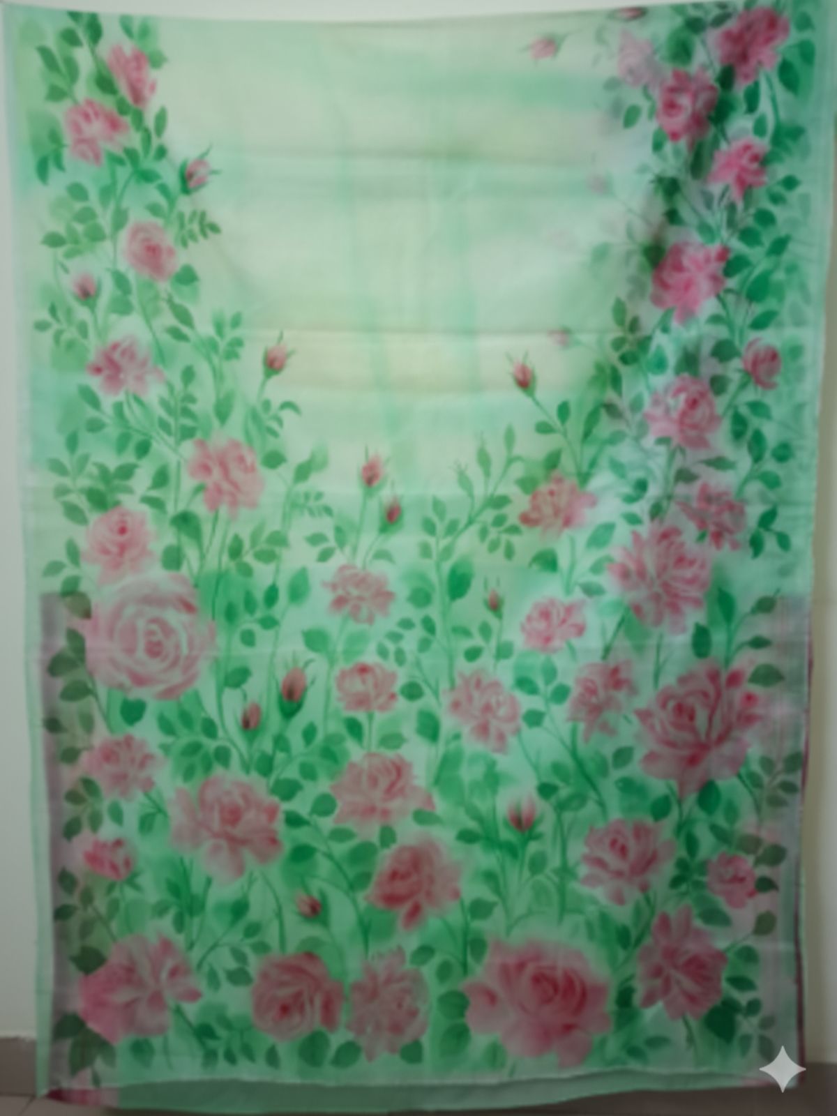 Inspired by the legendary gardens of Persia, the Baghe Gulab Saree showcases meticulously hand-painted rose motifs rendered in sumptuous, jewel-toned hues. This piece exemplifies the refined artistry of traditional Indian textile craftsmanship, merging historical narrative with contemporary aesthetic sensibility. Each brushstroke honors centuries of weaving heritage while delivering a garment of timeless sophistication and cultural resonance.