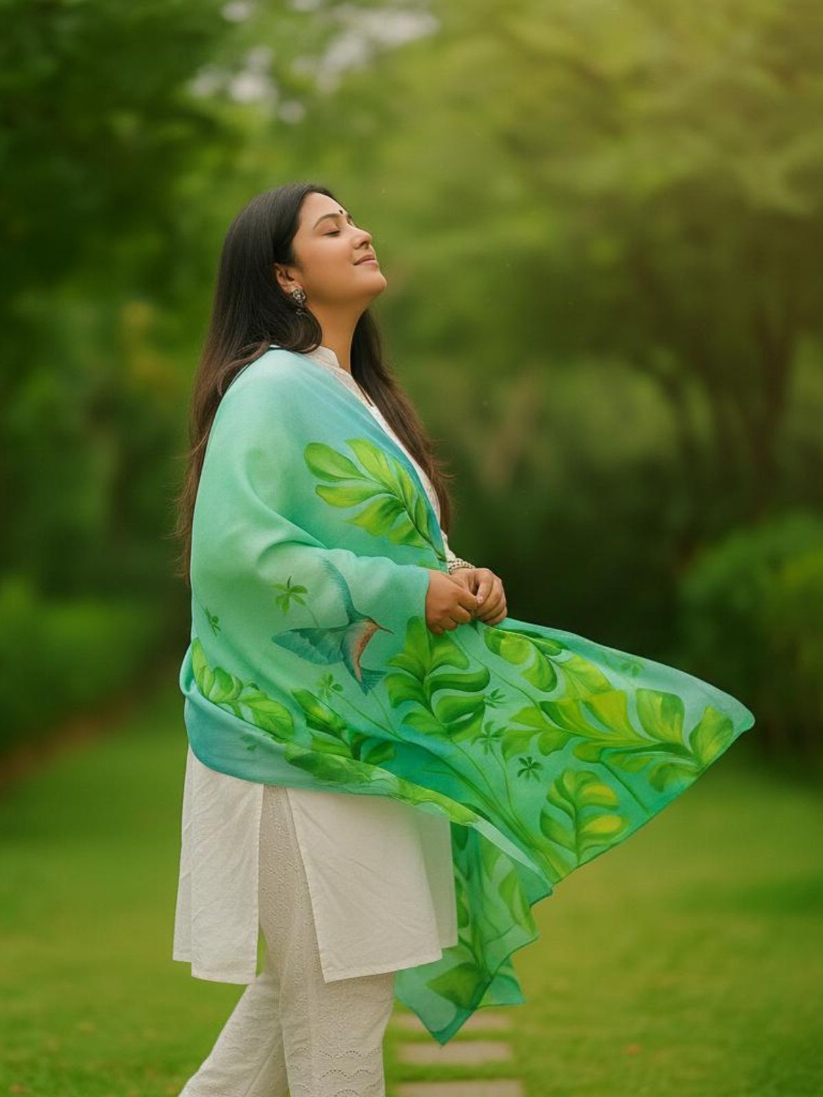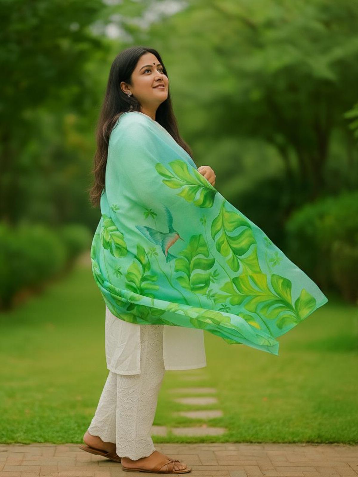 The Bulbul Stole captures the essence of India's most cherished songbird through meticulous hand-painting that honors traditional artisanal craftsmanship. Each stroke reflects nature's delicate beauty, translating the Bulbul's melodic presence into wearable art. This graceful drape seamlessly blends cultural heritage with contemporary elegance, making it an ideal choice for those who appreciate authentic, nature-inspired textiles. Perfect for elevating both formal and casual ensembles with understated sophistication.