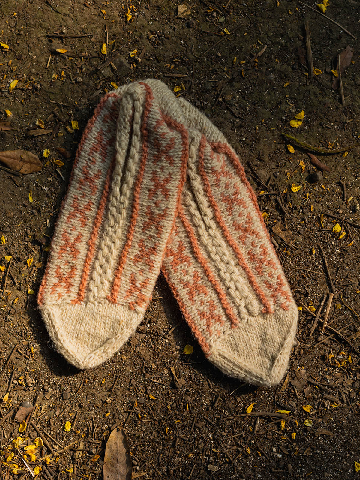 Extra thick, warm woollen socks with beautiful, unique motifs. These socks are knit by the shepherding community of Lahaul with their own wool which they handspin on the wooden takhli. Handspun and handknit by our women artisans, each pair is individual in design and colour. Orders will be based on colourway and size, and patterns may vary from the one shown in picture.