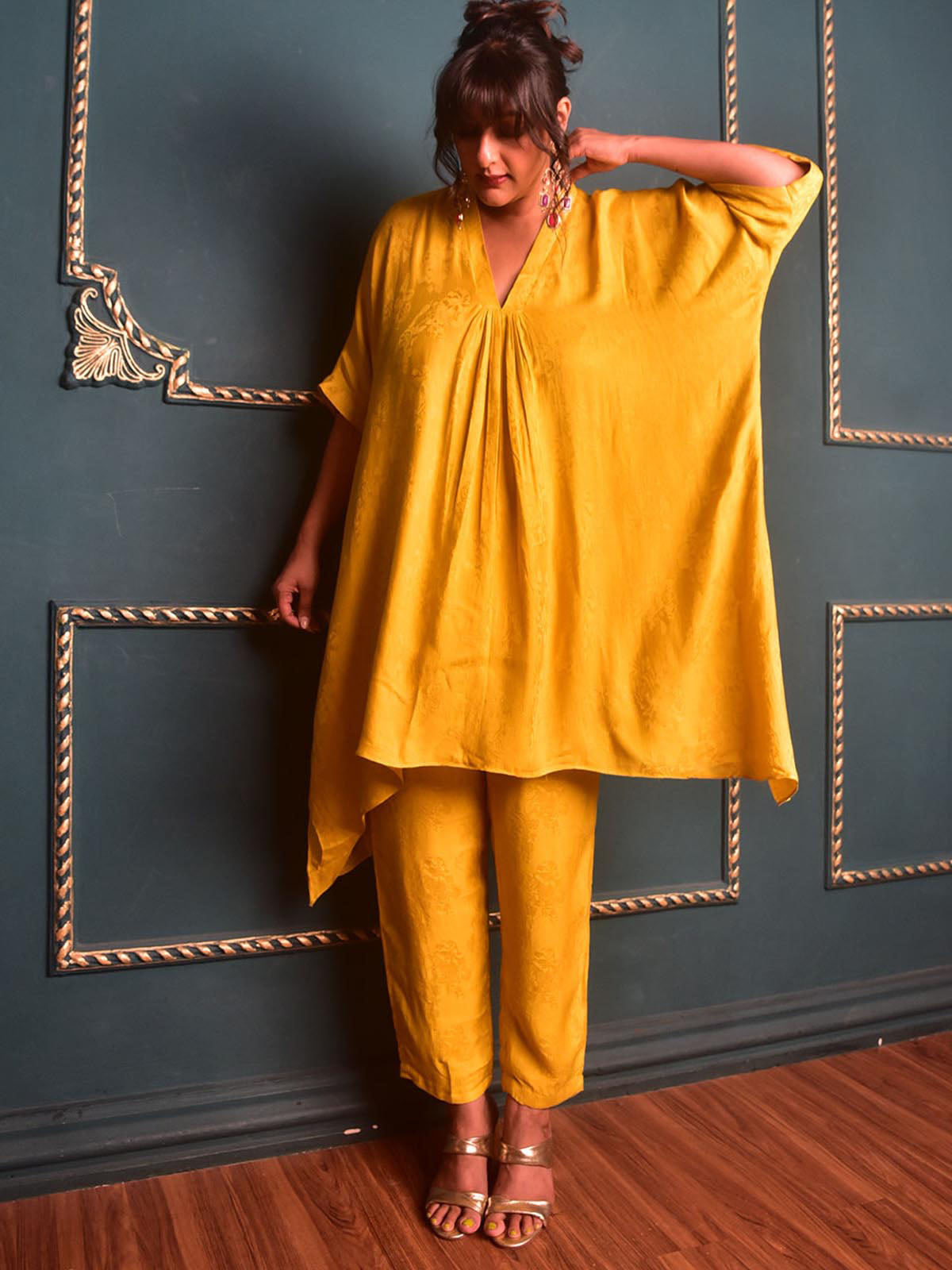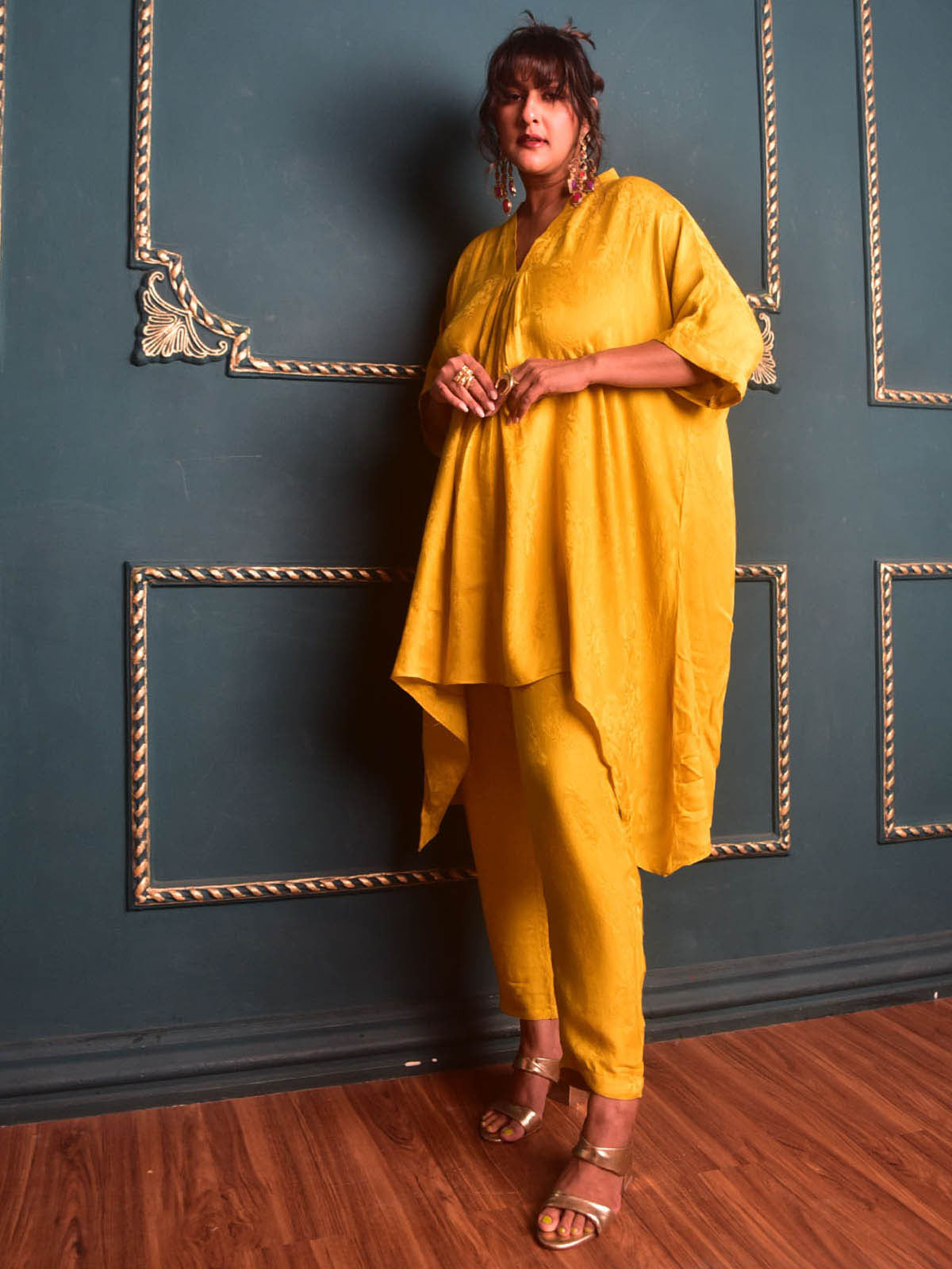The Raha Kurta Set effortlessly transitions from family brunches to cocktail parties with its chic design. Made from exclusive rich yellow gold viscose modal jacquard, this kurta features a woven pattern and an elevated sheen, complemented by stylish front pleats. Accompanied by matching Raha Pants, this set offers both comfort and sophistication. With no closures and a relaxed fit, it's easy to wear and style. Sourced from Chennai and expertly stitched by skilled artisans in Thane, this ensemble radiates elegance for any occasion.