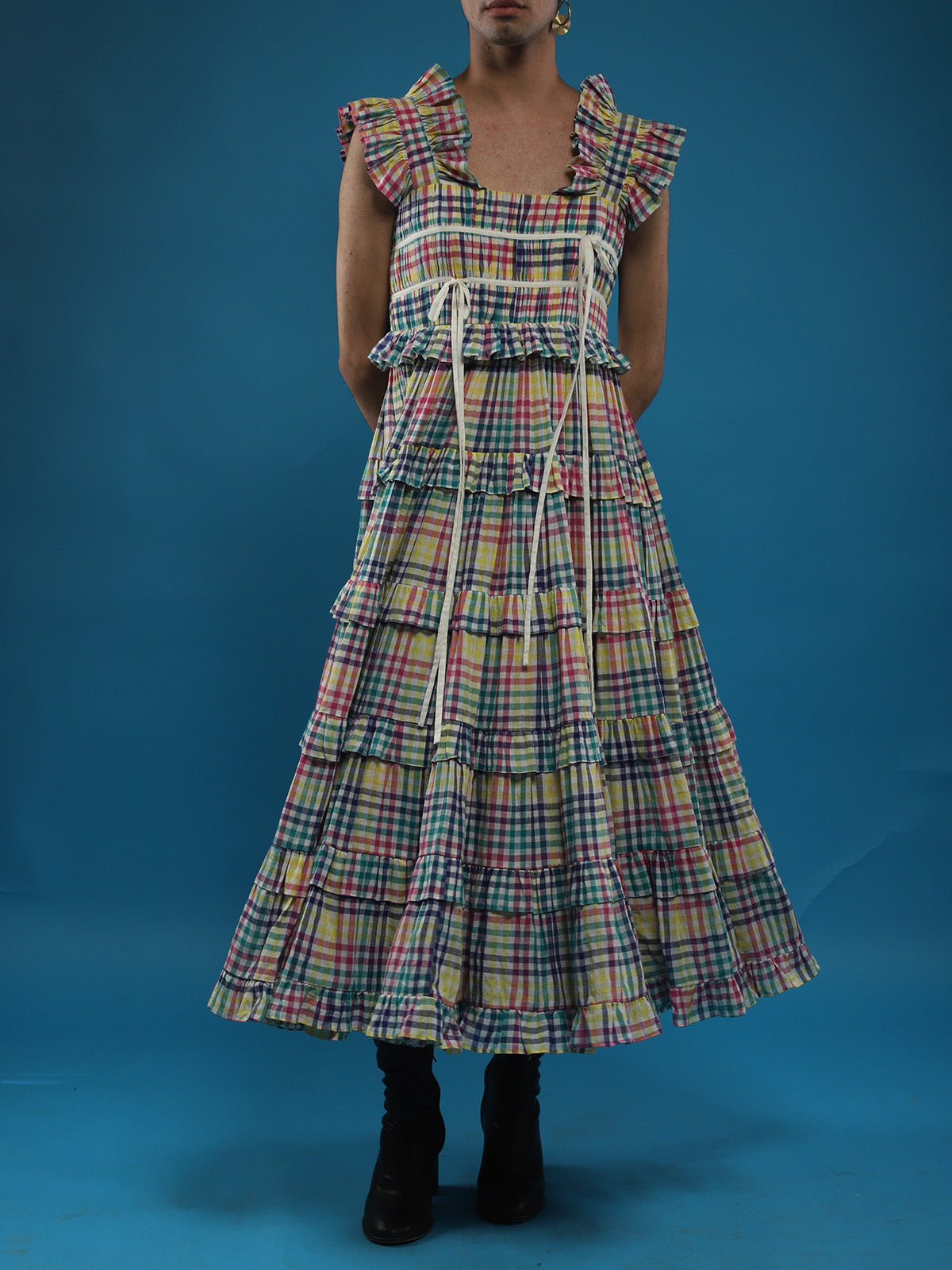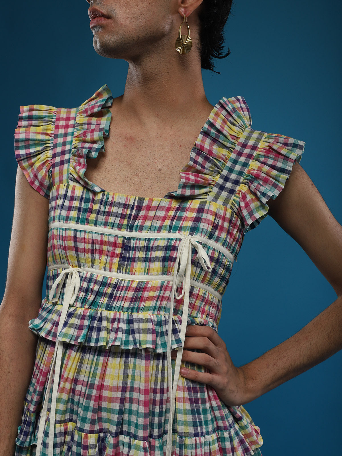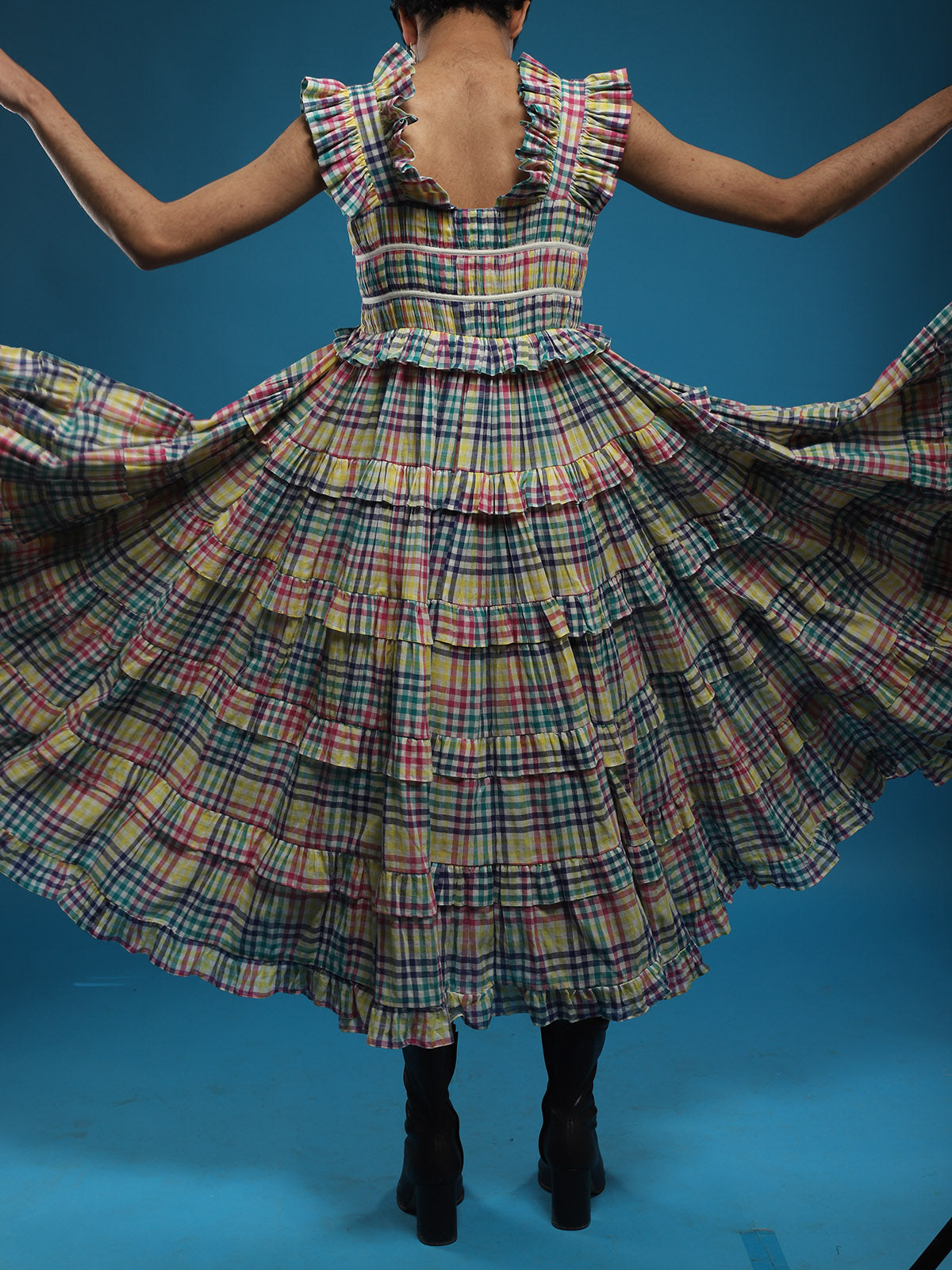 Introducing the Time Less Ankle Length Multi Tiered Paded Dress, featuring micro pleating at the yoke, gathering at the shoulders, a side zipper, and dori detailing at the chest. Partially lined with a length of 54", this dress is made from handwoven 100% cotton fabric. Care instructions include drywashing initially, followed by hand washing in cold water with mild detergent. Please note, this item cannot be returned but is exchangeable for a different size.