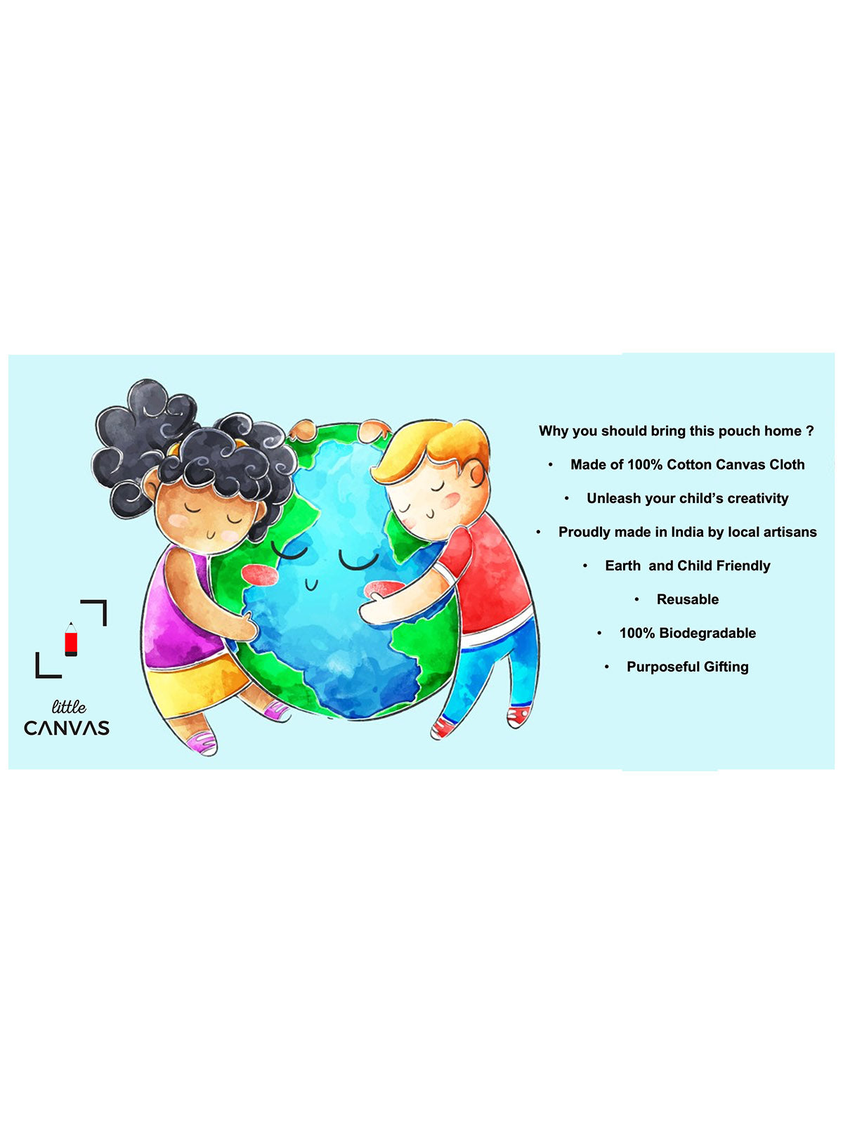 All kids love to colour. Unleash the Picasso inside your little ones with this unique , one of a kind , eco friendly pouches. Depending upon the age of the kid , the pouches made of canvas cloth can be easily coloured with crayons, sketch pens or acrylic paints. Post the colouring the kids can use their master pieces of art for carrying stationery to schools, for carrying small toys for a play date, for keeping colours, pencils, small toys at home. The cotton fabric is unprocessed and is of 7 ounces. Each pouch is crafted in India. It is 100% biodegradable and can save a lot of plastic use.
