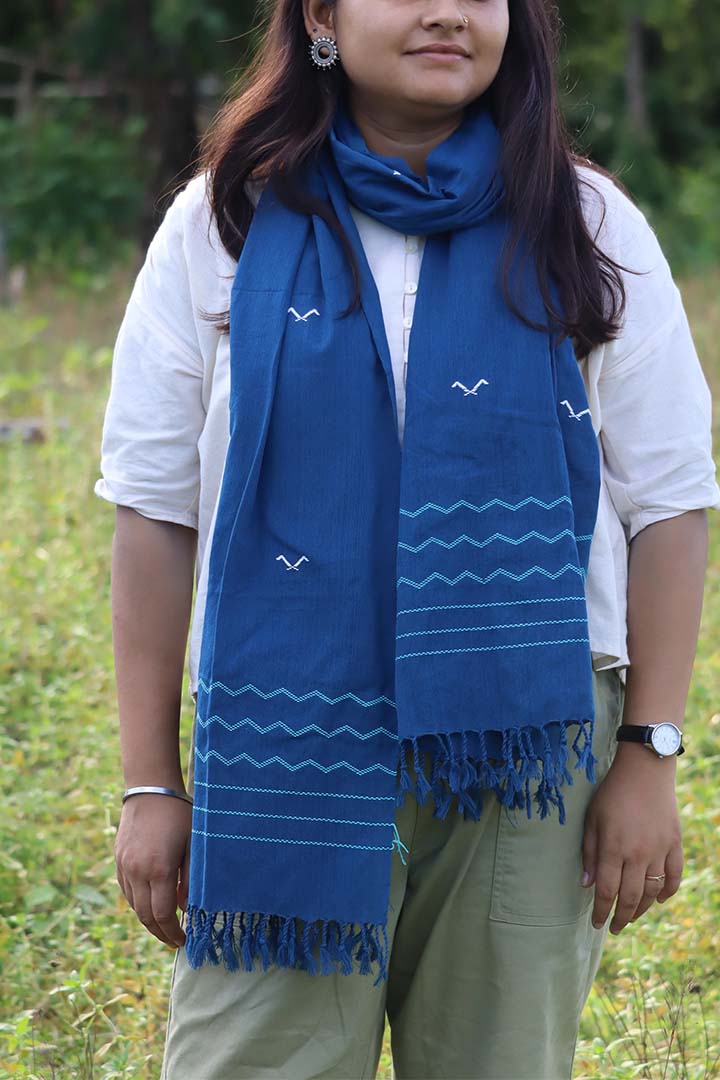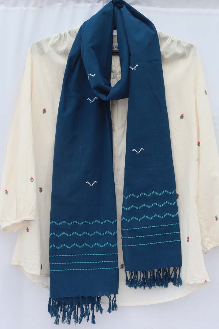 This is a Bird and wave pattern stole, traditionally handwoven by the Mising tribe women in Majuli. the motifs are usually inspired by the local flora, fauna & landscape imitating the flowers, ferns, trees, butterflies, animals, birds, and waterbodies. Traditional looms in Majuli are manual, throw shuttle looms. The motifs are manually inserted using the extra weft technique which is almost like embroidery on the loom.