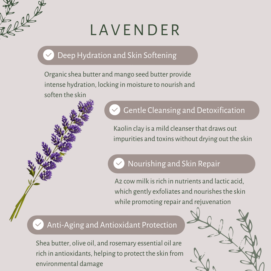 Experience a spa-like cleanse with our Lavender Soap Bar. Enriched with honey, cocoa and mango butter, and A2 cow milk, it deeply nourishes, soothes irritation, and restores moisture. Gentle botanicals brighten and detoxify, while lavender essential oil calms your senses, leaving skin soft, radiant, and beautifully refreshed.