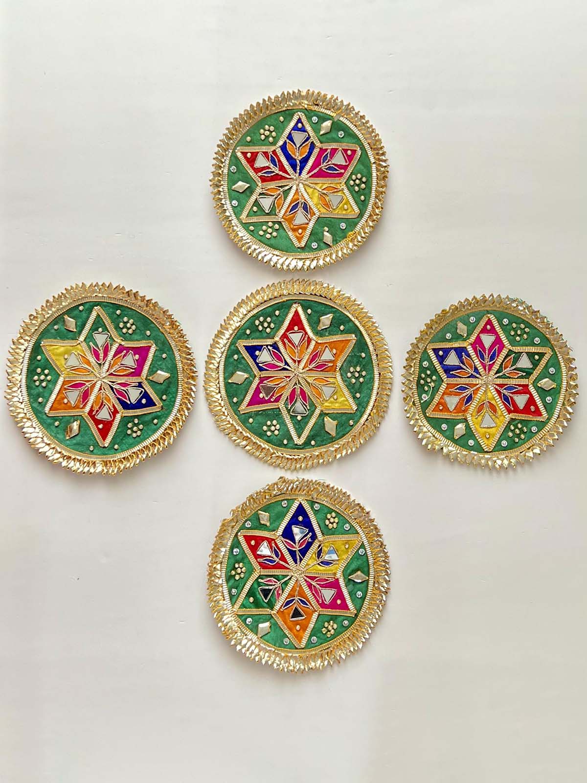 Infuse your home with festive cheer using this vibrant Floor Gota, Beads, and Sequins Rangoli! Perfect for Diwali, this beautiful decor welcomes Goddess Lakshmiji and enhances your entrance or favorite spaces. Gather the whole family for a fun, mess-free bonding experience as you create unique designs, adding fresh flowers and earthen diyas for an extra touch. Handcrafted by skilled artisans with traditional threads, gota, silk, and sequins, this rangoli is not only stunning but also reusable for future celebrations. Its intricate, colorful design will surely make your home warm, cozy, and inviting.
