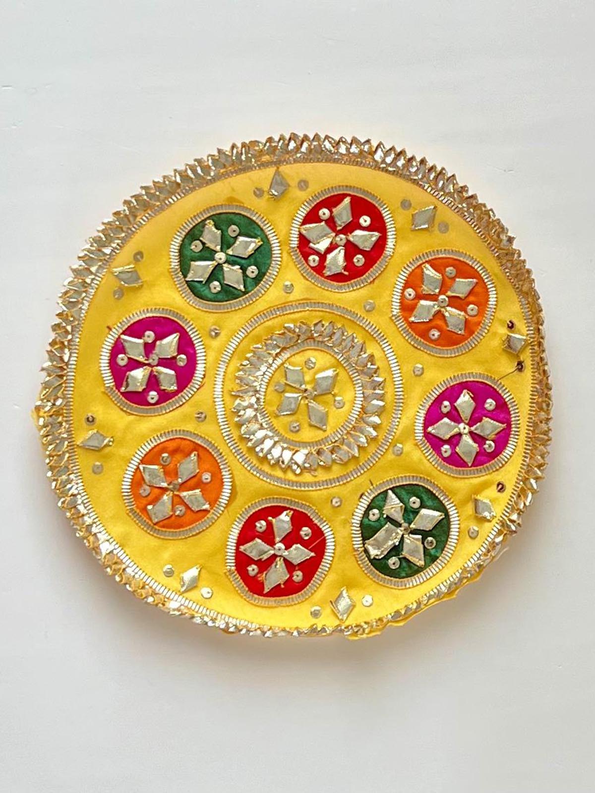 Infuse your home with festive cheer using this vibrant Floor Gota, Beads, and Sequins Rangoli! Perfect for Diwali, this beautiful decor welcomes Goddess Lakshmiji and enhances your entrance or favorite spaces. Gather the whole family for a fun, mess-free bonding experience as you create unique designs, adding fresh flowers and earthen diyas for an extra touch. Handcrafted by skilled artisans with traditional threads, gota, silk, and sequins, this rangoli is not only stunning but also reusable for future celebrations. Its intricate, colorful design will surely make your home warm, cozy, and inviting.