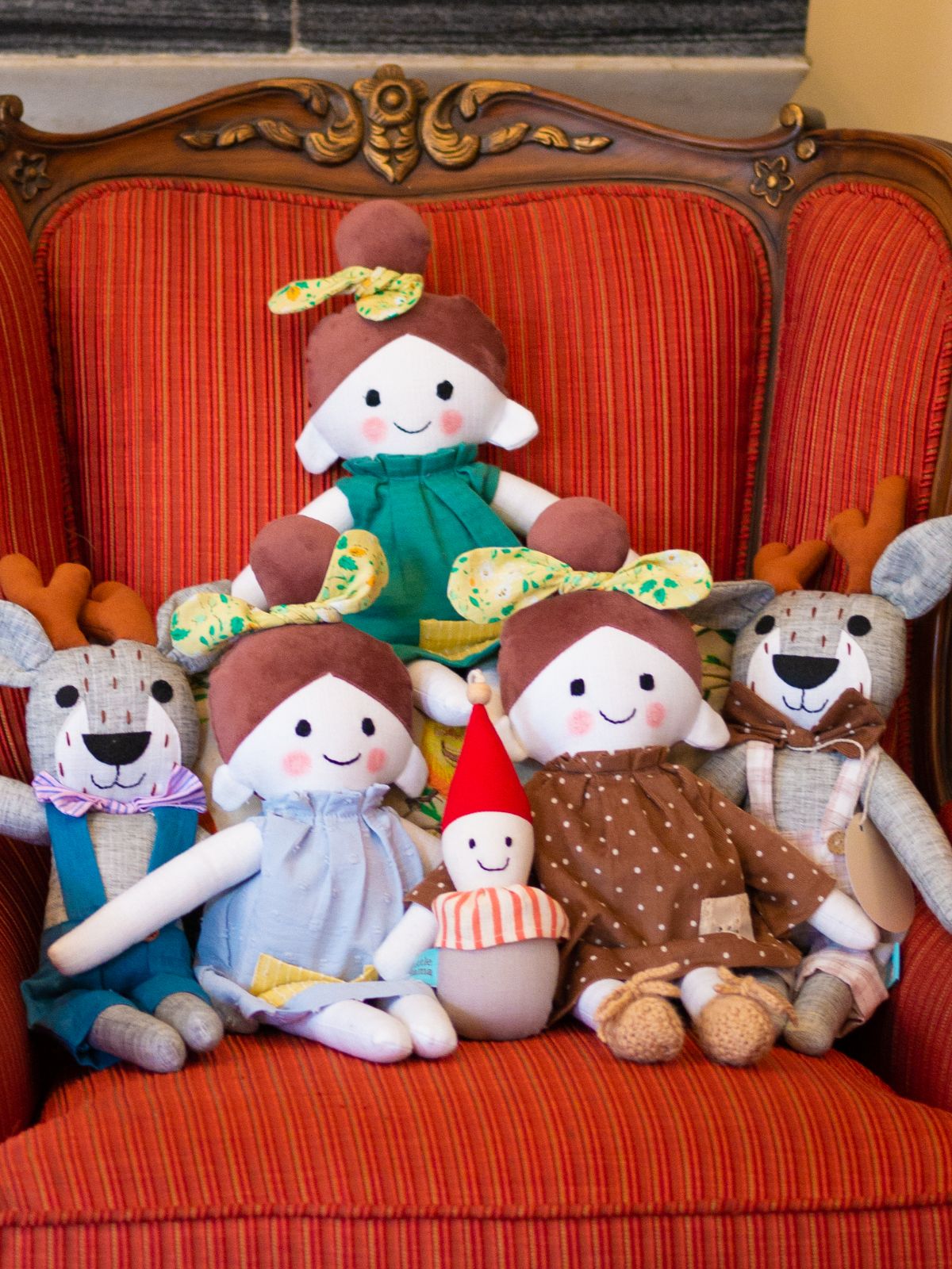 Emma, a fabric doll with a bun has a soft, plush body made from fabric, giving it a warm and inviting appearance. She typically have a stitched face with simple features like embroidered eyes, a small nose, and a smiling mouth, lending it a cute and friendly look. The hair, styled into a neat bun, are made from velvet fabric strips. The bun has been adorned with tiny fabric bows to add extra detail and charm. Emma is dressed in a simple outfit, like a dress, with delicate stitching and vibrant colours. The colours and patterns of the outfit could vary, from solid pastels to playful floral prints or stripes, depending on the intended look and style. Overall, the doll has an endearing, timeless quality, designed to be both a cuddly companion and a decorative piece, with the bun hairstyle serving as a sweet focal point.