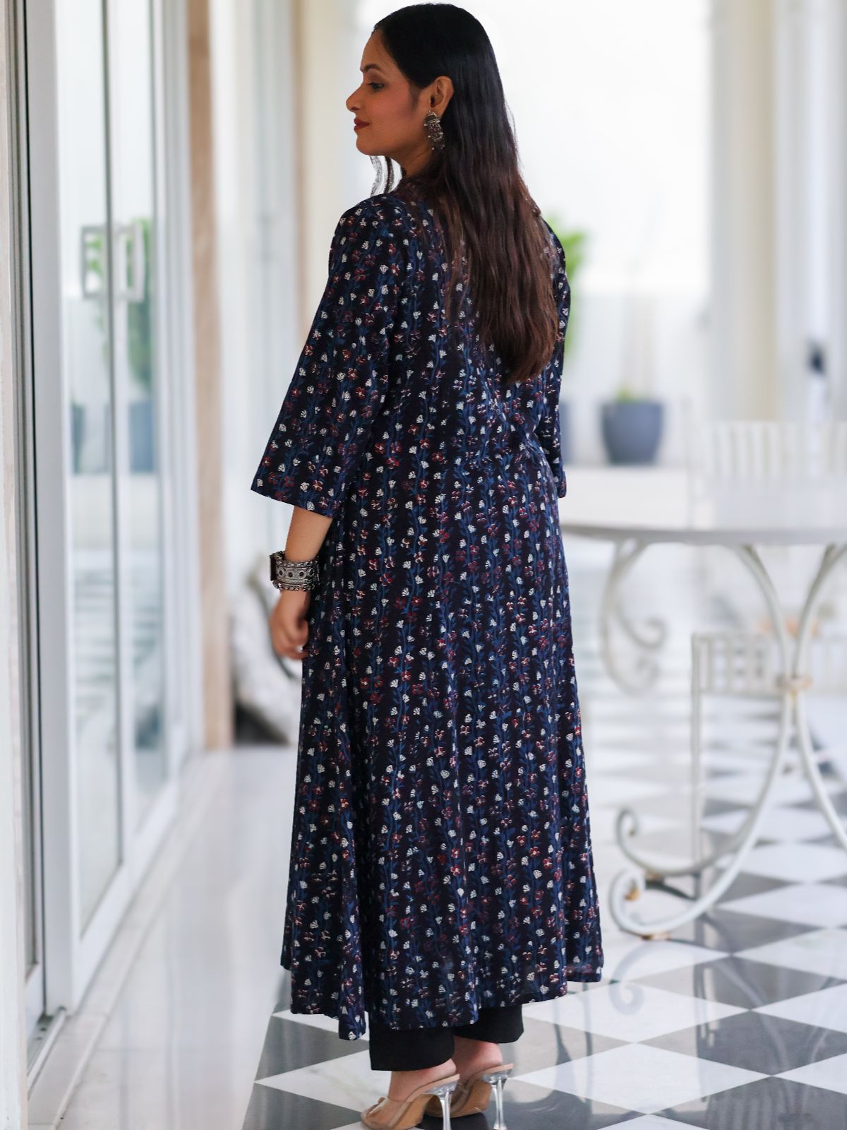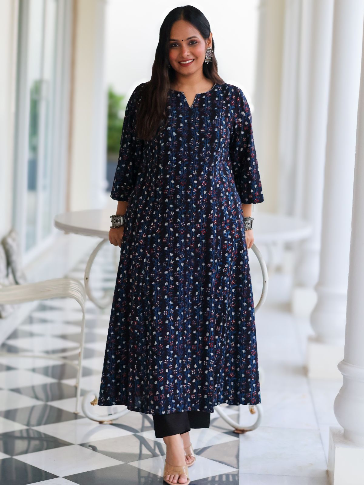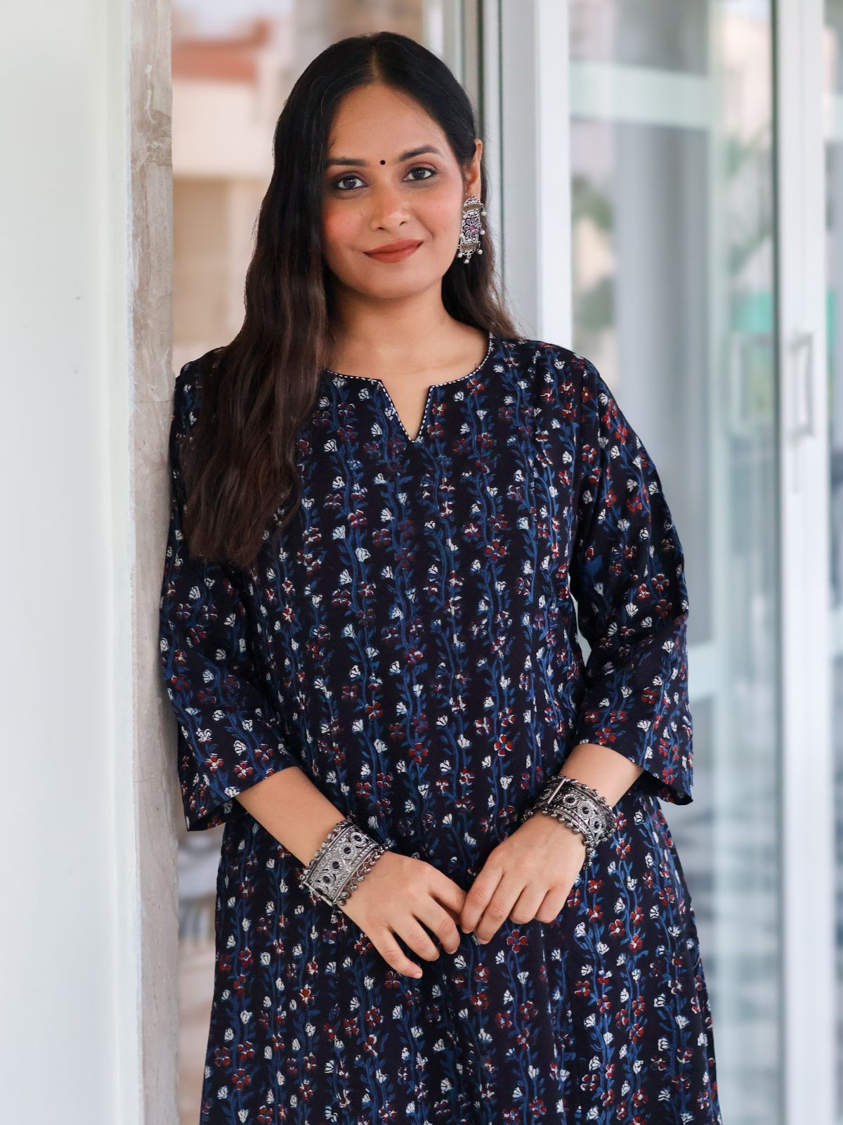 This festive ensemble features a circular cut Kali kurta, 3/4th sleeves, a round neck with a V cut-out, and an amazing flare fall with side pockets. The pants are a relaxed fit for ultimate comfort. Comfortable enough for everyday wear, polished enough for a festive dinner - it’s a wardrobe investment you’ll keep coming back to. The kurta set is stitched by our skilled artisans in Jaipur.