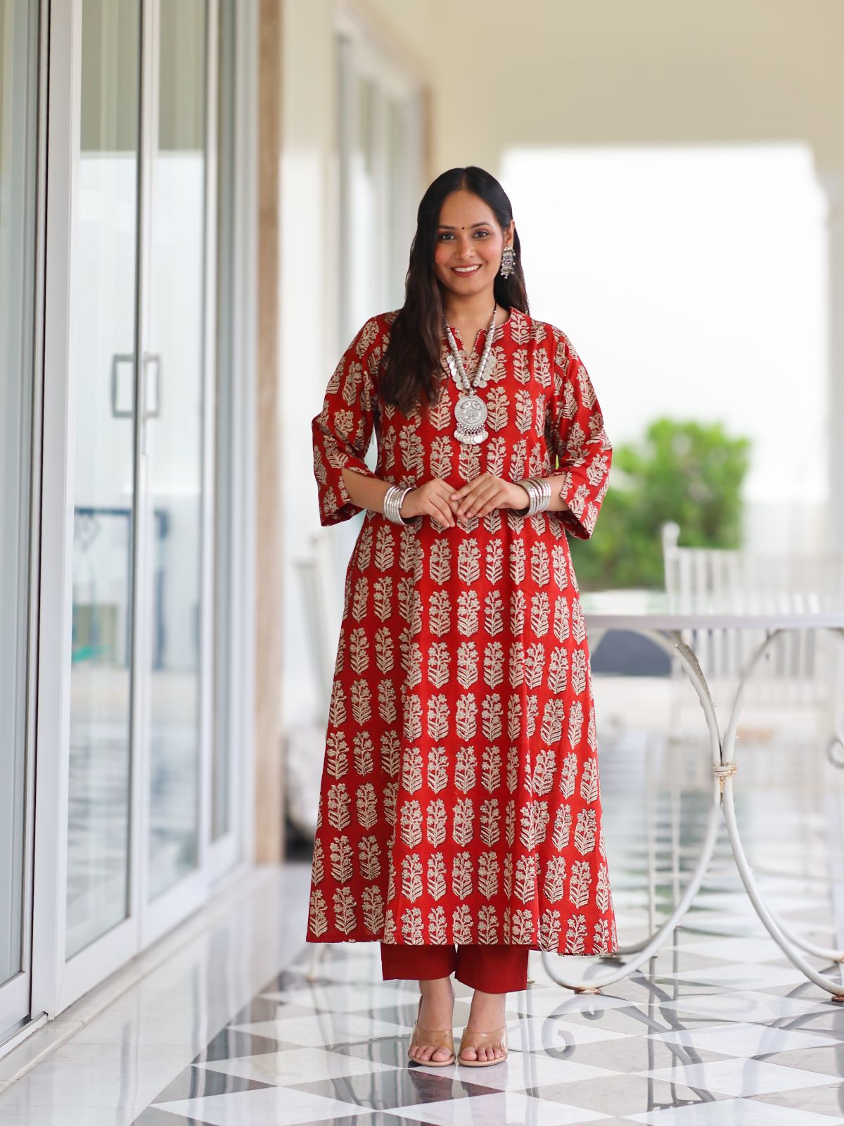This festive ensemble features a Kali cut kurta, 3/4th sleeves, a round neck with a V cut-out, and an amazing flare fall with side pockets. The pants are a relaxed fit for ultimate comfort. Comfortable enough for everyday wear, polished enough for a festive dinner - it’s a wardrobe investment you’ll keep coming back to. The kurta set is stitched by our skilled artisans in Jaipur.