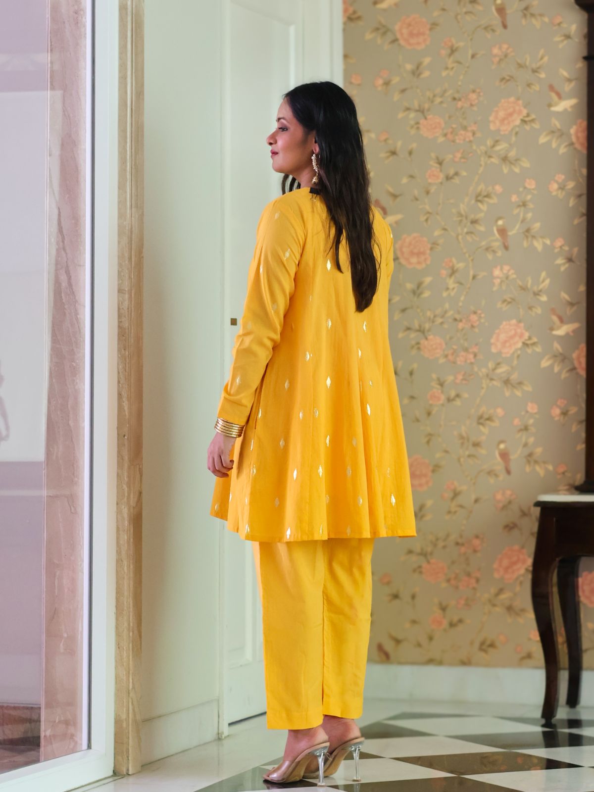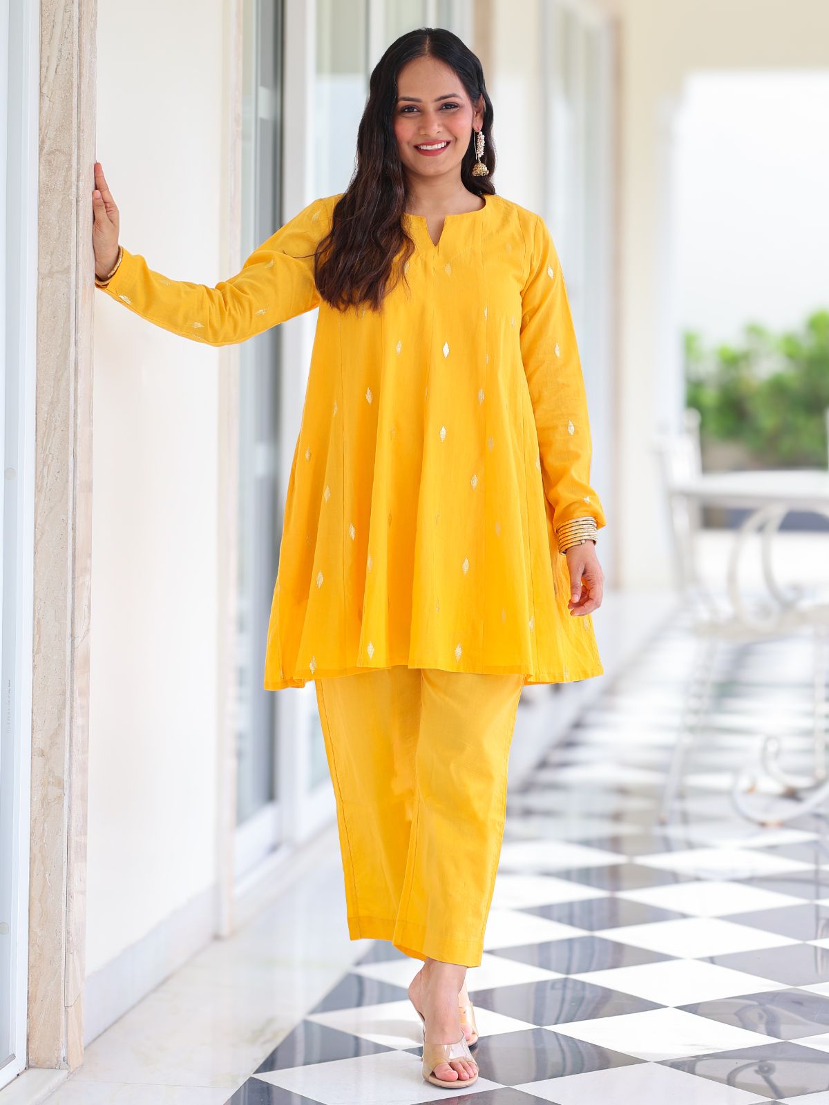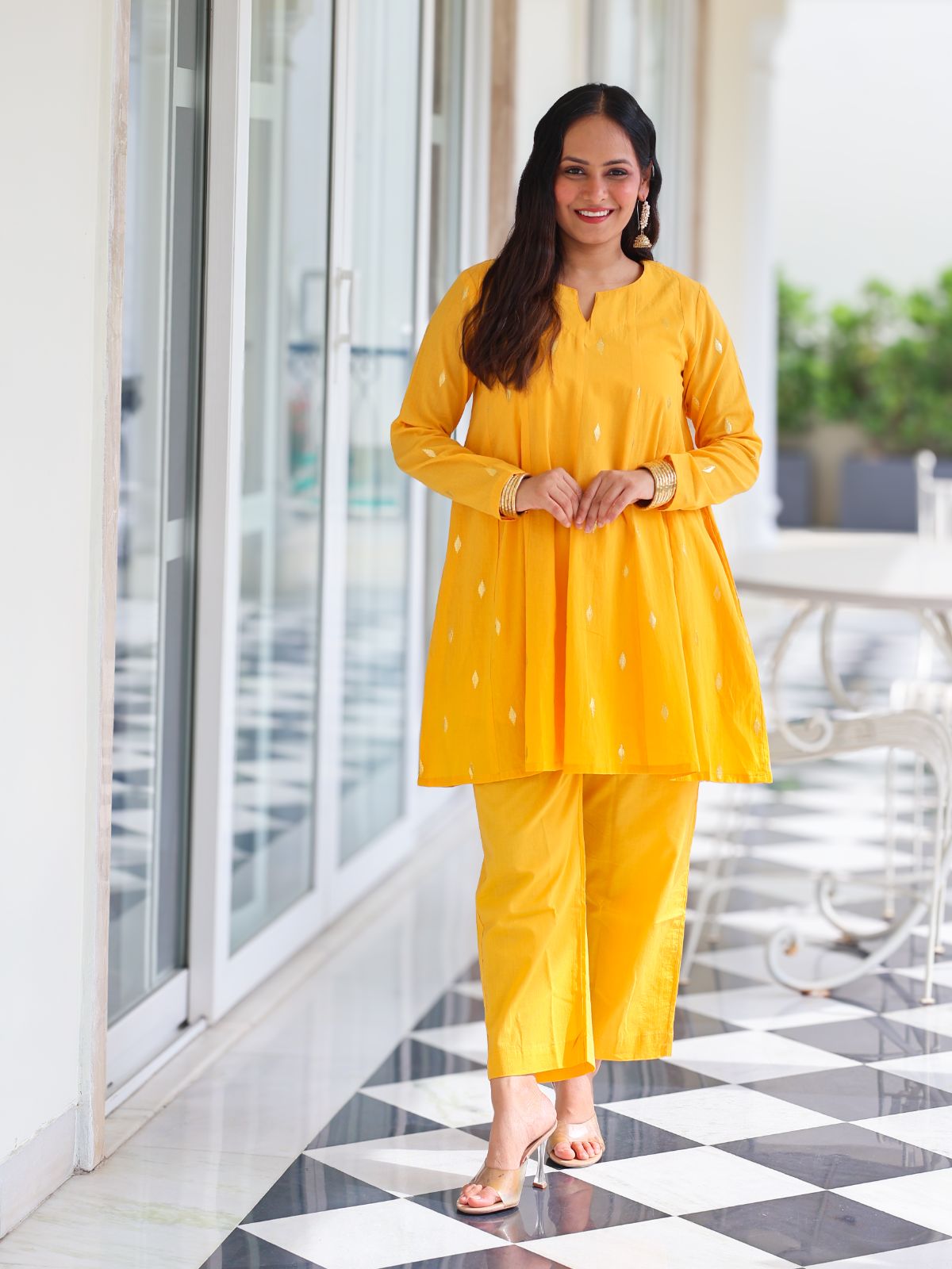 This festive ensemble features a full-length sleeve Kurta, with a split V-neckline, and a circular kali cut for an amazing flare. The Kurta also comes with side-seam pockets and an Inner slip for ultimate comfort. The pants are a relaxed fit with side pockets. From office Diwali lunches to Ganesh Pujan functions - in this sweet color you’ll never feel overdressed. It’s elegance you can actually live in. The kurta set is stitched by our skilled artisans in Jaipur.