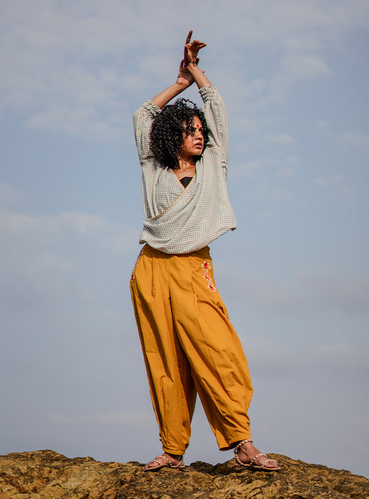 This Set brings together the fluid elegance of the Diamond Check Twisted Draped Top with the grounded comfort of the Yellow Dart Pants. The twisted wrap silhouette in breathable handloom cotton adds a sculptural, modern edge to timeless diamond checks, highlighted with contrast yellow piping and soft sleeve gathers. Paired with our tapered yellow pants featuring button accents and signature bindi embroidery, this look is both relaxed and statement-making—perfect for creative days, casual gatherings, or soulful getaways.