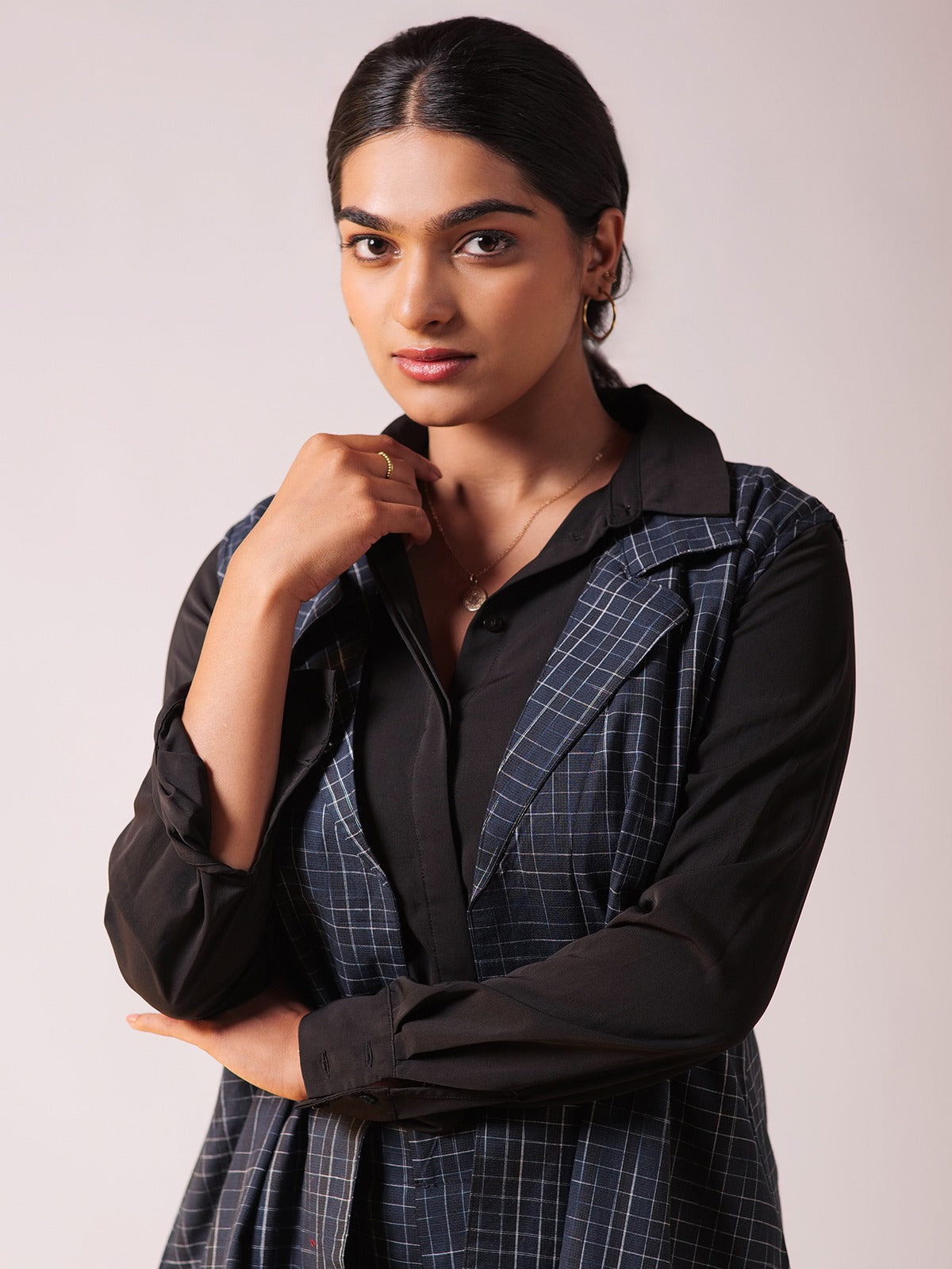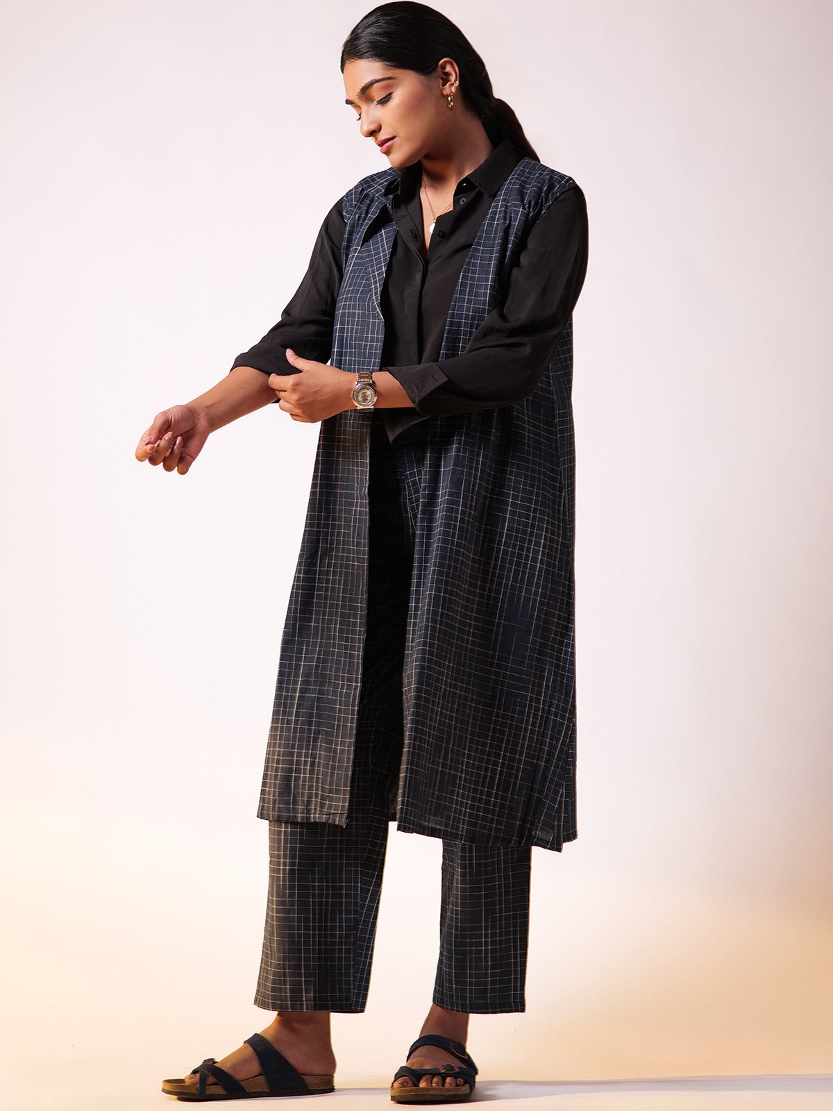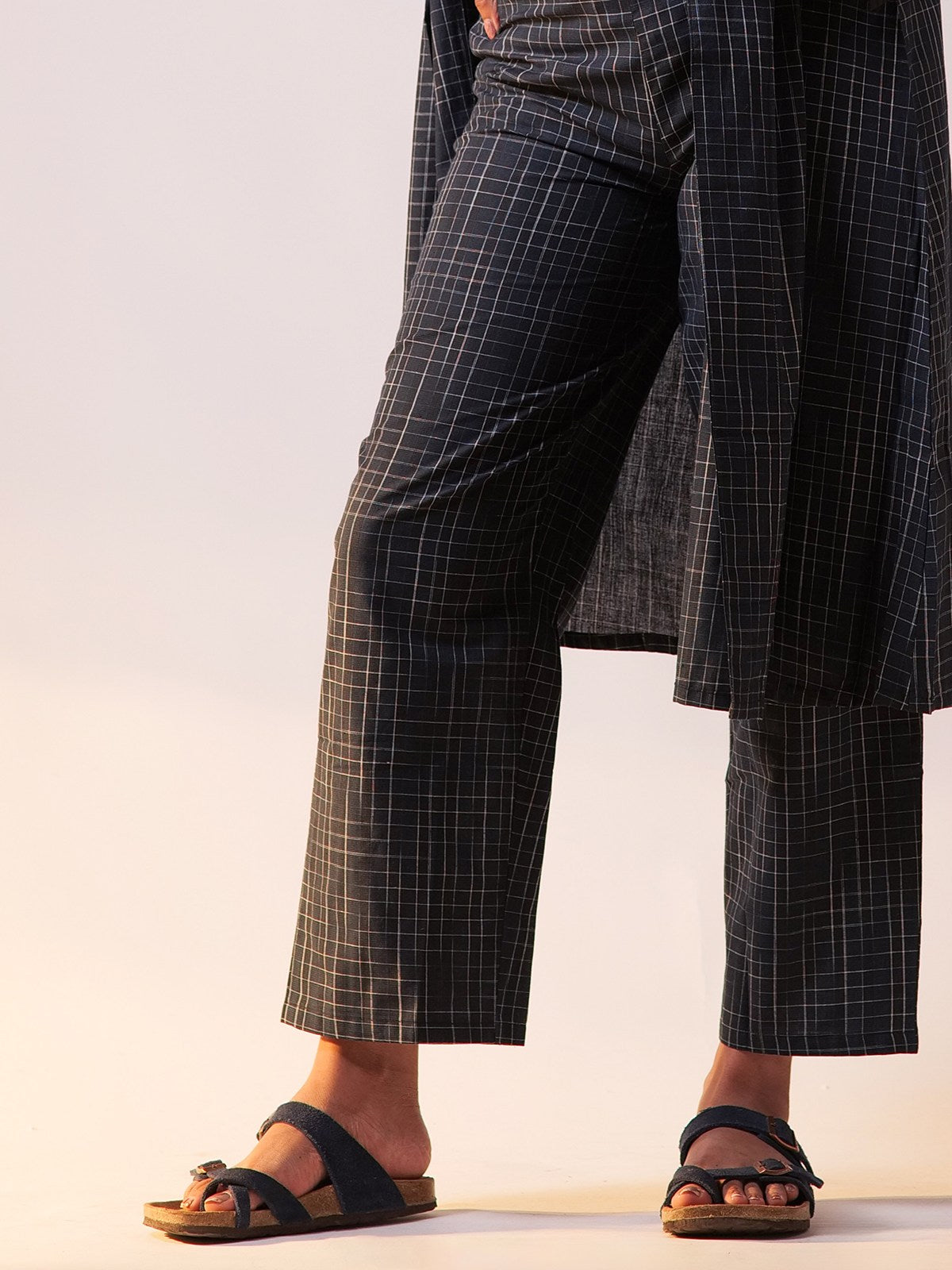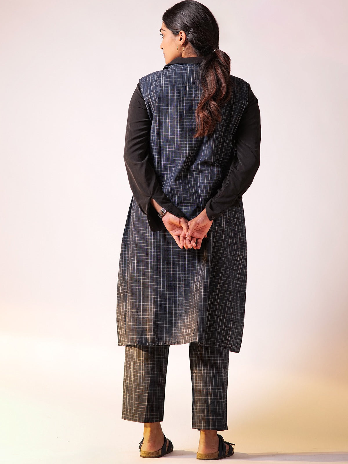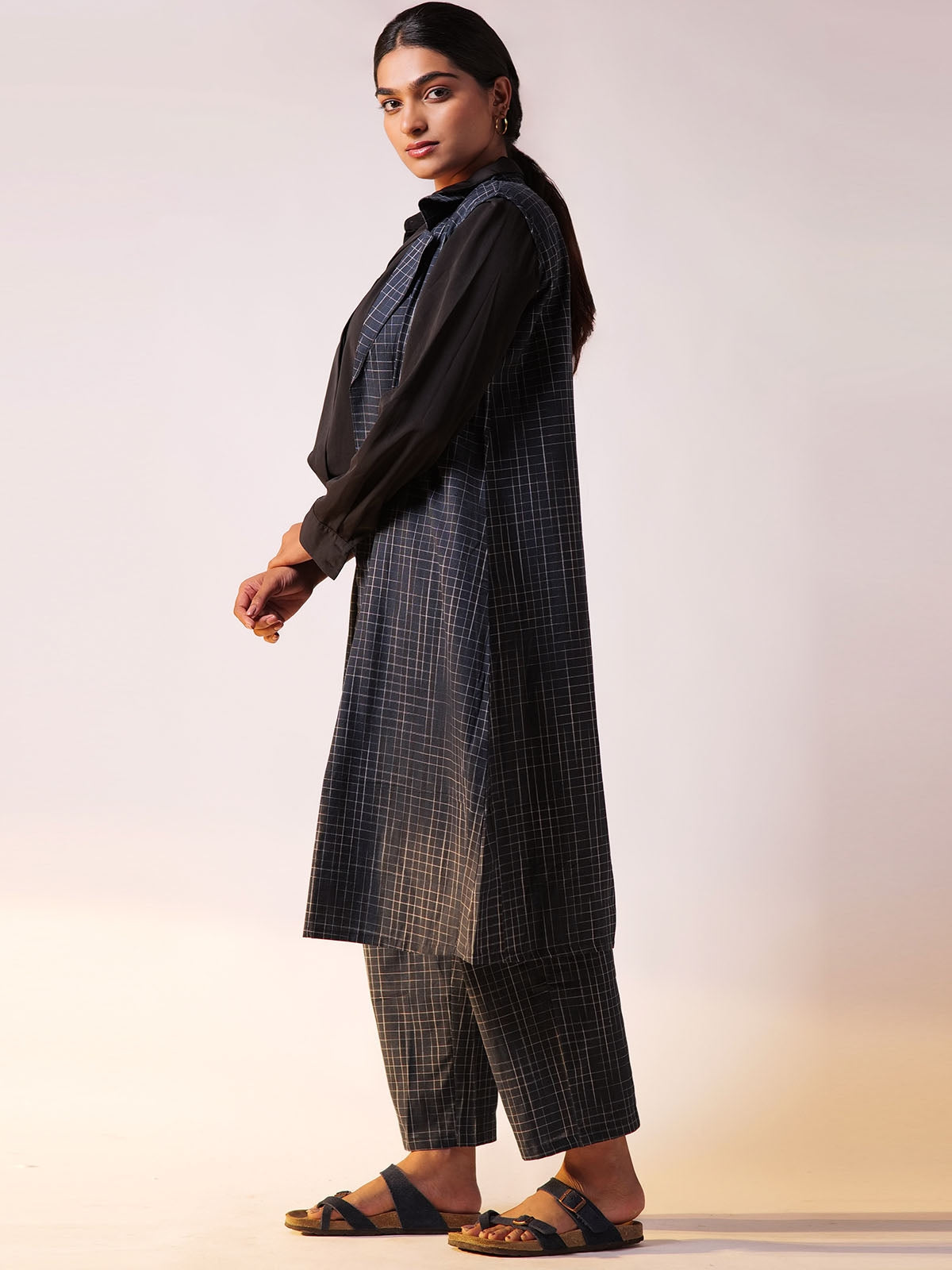 A sleeveless, openfront longline blazer adds a modern, structured touch while keeping it breathable. Wideleg, cropped trousers offer comfort and an easygoing vibe, perfect for allday wear. Coordinated bold blue tones with a subtle quad pattern bring depth and cohesion to the look. Styled over a crisp white shirt, it balances formal and elevated, ideal for both work and casual outings. It comes with attached sleeves for carrying a completely formal look