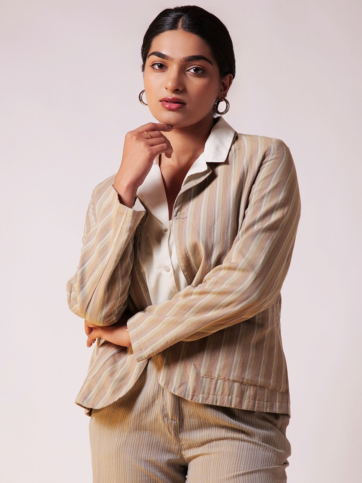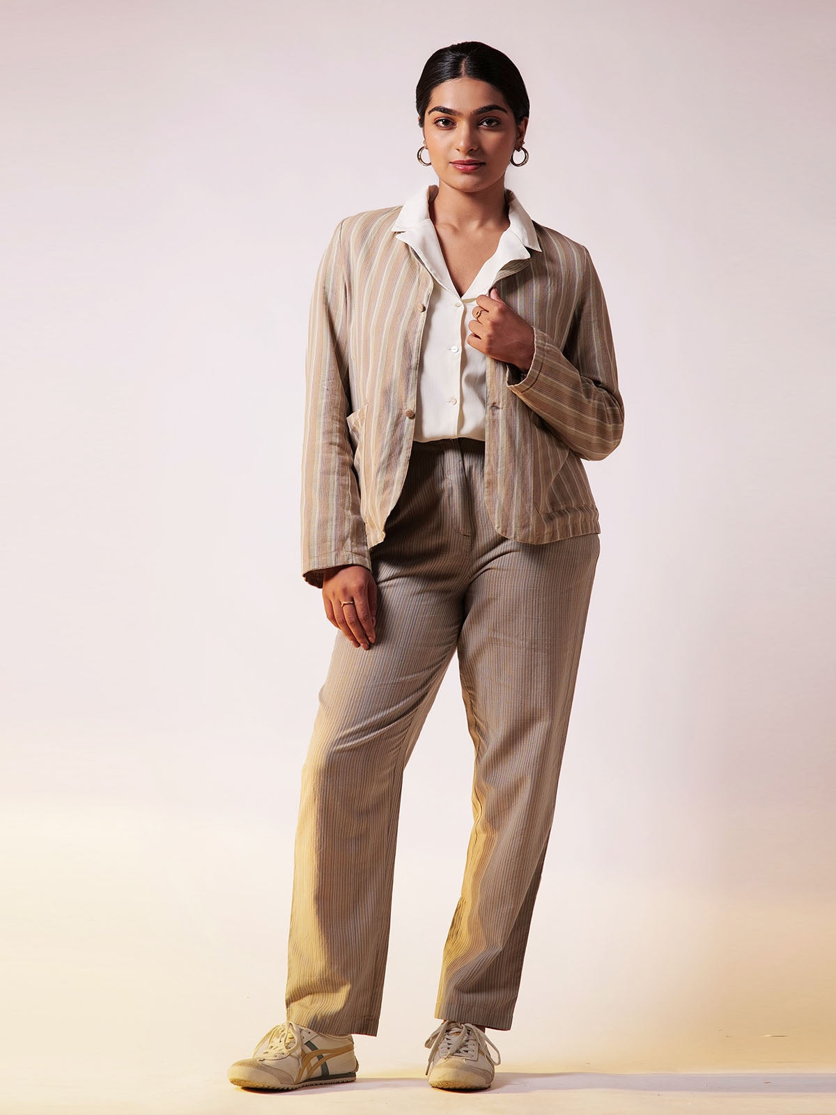 This set offers a reversible blazer, giving you versatile styling options with a single piece. Effortlessly switch between two distinct looks, perfect for transitioning from work to afterhours. The soft, earthy striped pattern is subtle yet eyecatching, blending neutral tones that add warmth and sophistication to your wardrobe. Ideal for both minimalists and those who love understated elegance. Thoughtful details like roomy front pockets, a back slit for ease of movement, and adjustable buttons inside and out showcase both form and function. The tailored yet relaxed fit complements a variety of body types, offering a structured look without compromising on comfort. The highwaisted pants enhance your silhouette, elongating the legs.