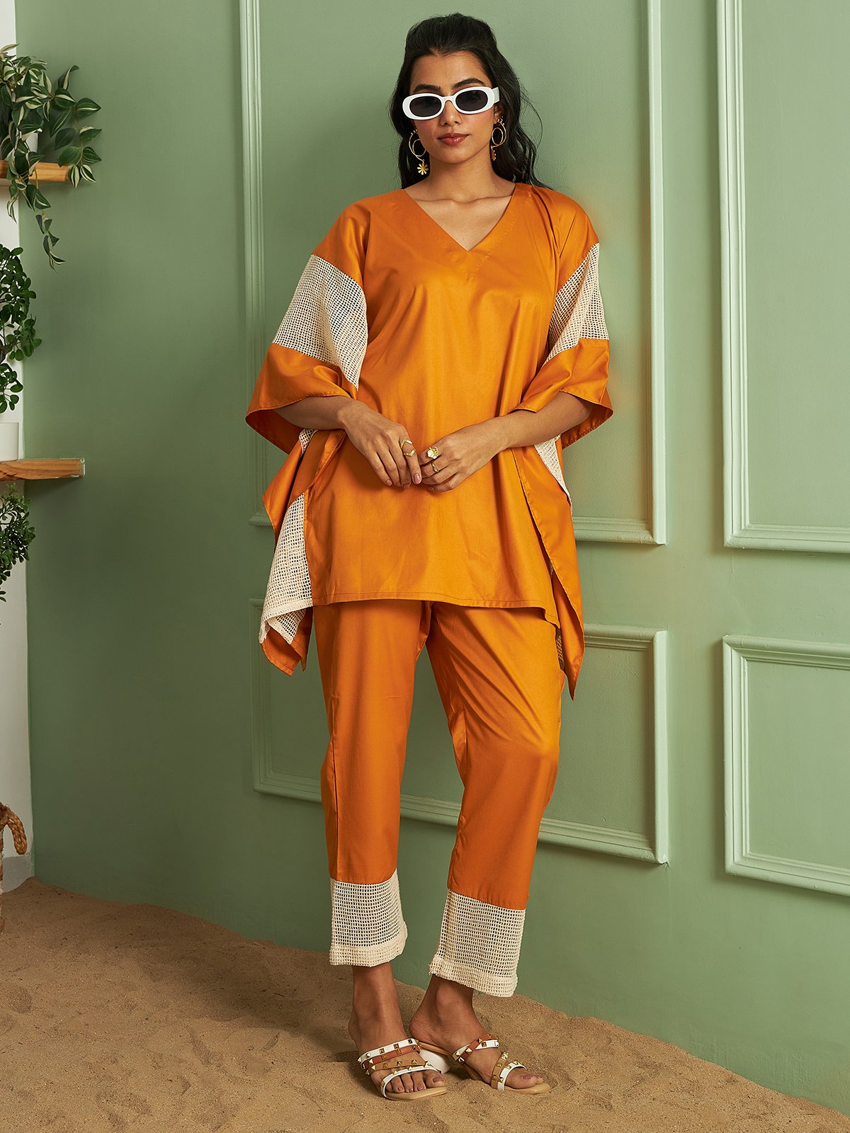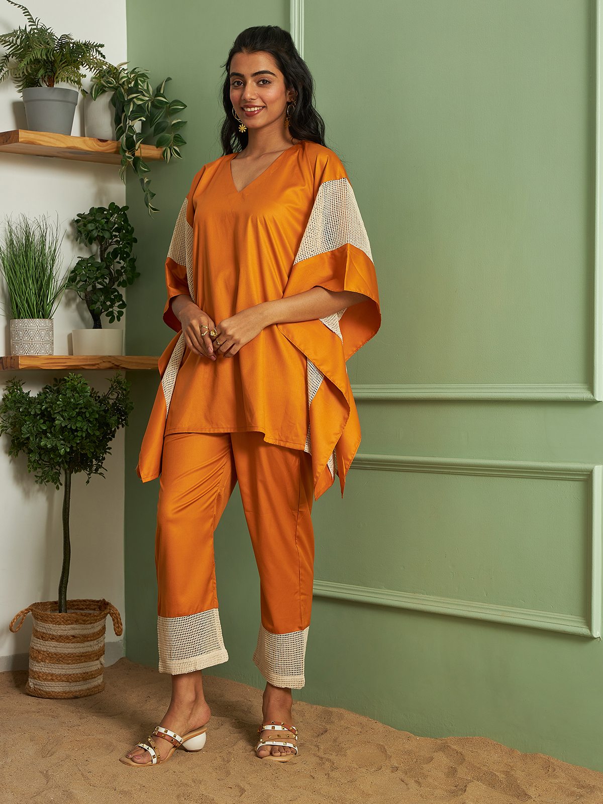 Elevate your loungewear with this breezy co-ord set featuring a relaxed-fit mesh kaftan and straight-leg pants. The tan base is layered with sheer mesh fabric for a luxurious touch. Ideal for days when you want to feel comfortable without compromising on style.