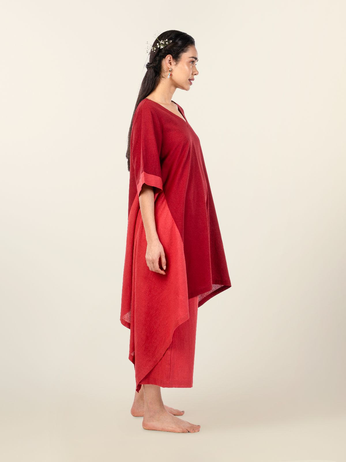 Step into effortless sophistication with this A-line color-block co-ord set, designed for women who embrace comfort with style. The uneven hemline tunic features a flattering V-neckline, quarter sleeves, and a graceful silhouette that moves beautifully with every step. Crafted from breathable cotton-linen, it offers a perfect blend of fluidity and structure. The warm tones of maroon and red bring a festive energy to the look, while the uneven hem adds a contemporary edge. Ideal for celebrations, parties, or elevated everyday dressing,