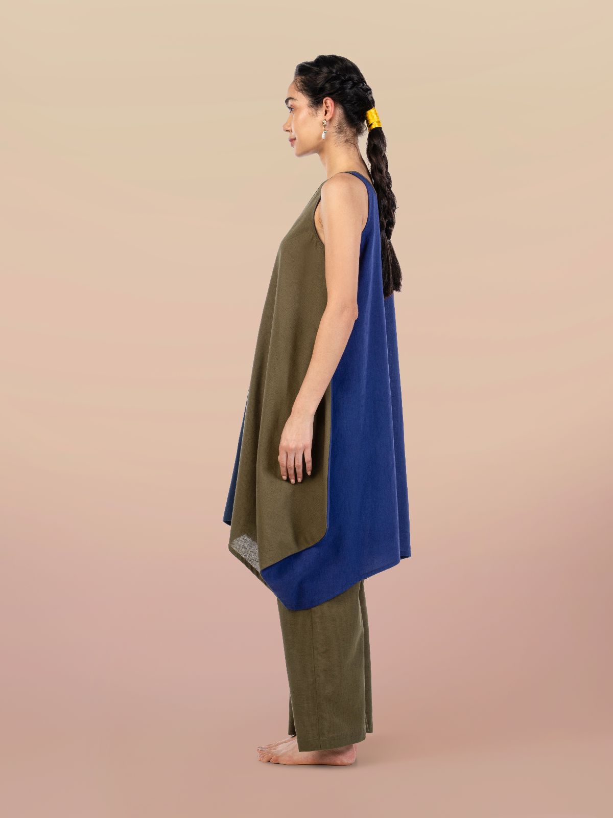 Playful, breezy, and effortlessly modern, this A-line cotton-linen co-ord set captures a sense of ease and movement. The sleeveless tunic features a flattering V-neckline and an uneven hemline, creating a relaxed yet refined silhouette. Designed for comfort and versatility, its cool-toned color block in olive and shades of blue draws inspiration from the harmony and contrast of nature evoking fluidity, balance, and a touch of artistic charm.