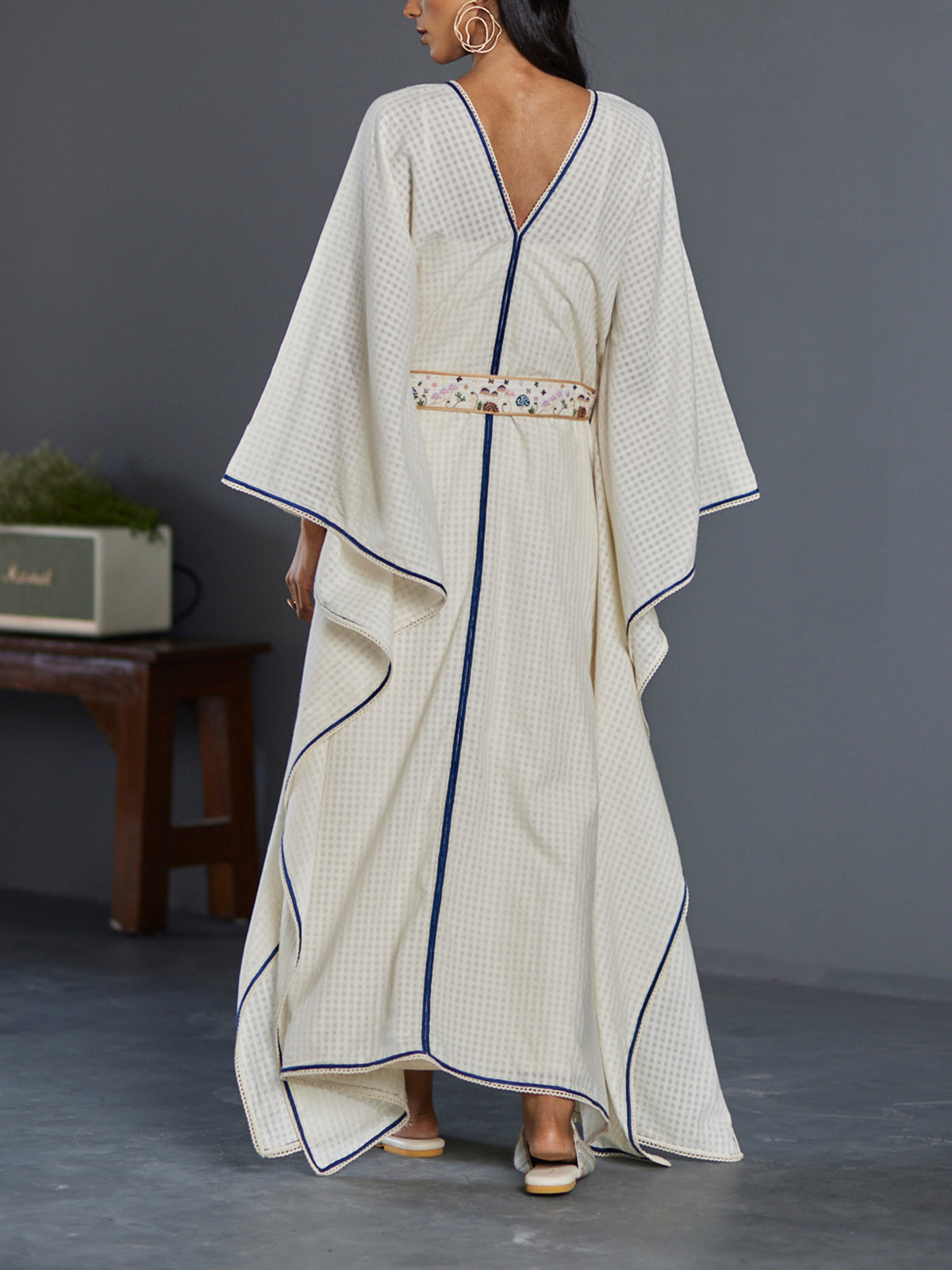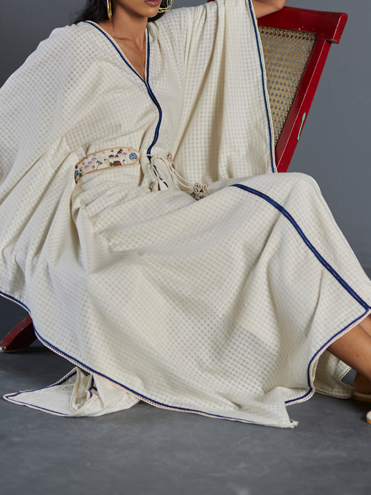 Go with the Flow Kaftan is crafted from handwoven, self-check cotton fabric, giving it a unique texture and sheen. It is detailed with hand embroidered contrast blue for added finesse, and completed with a hand embroidered multi colour mushroom belt. Details such as french knots and shaded mushroom motifs provide elegance and style, and the tassel tie-ups offer an individualistic finish. Perfect for holiWorking Days, this kaftan brings comfort and beauty in one.