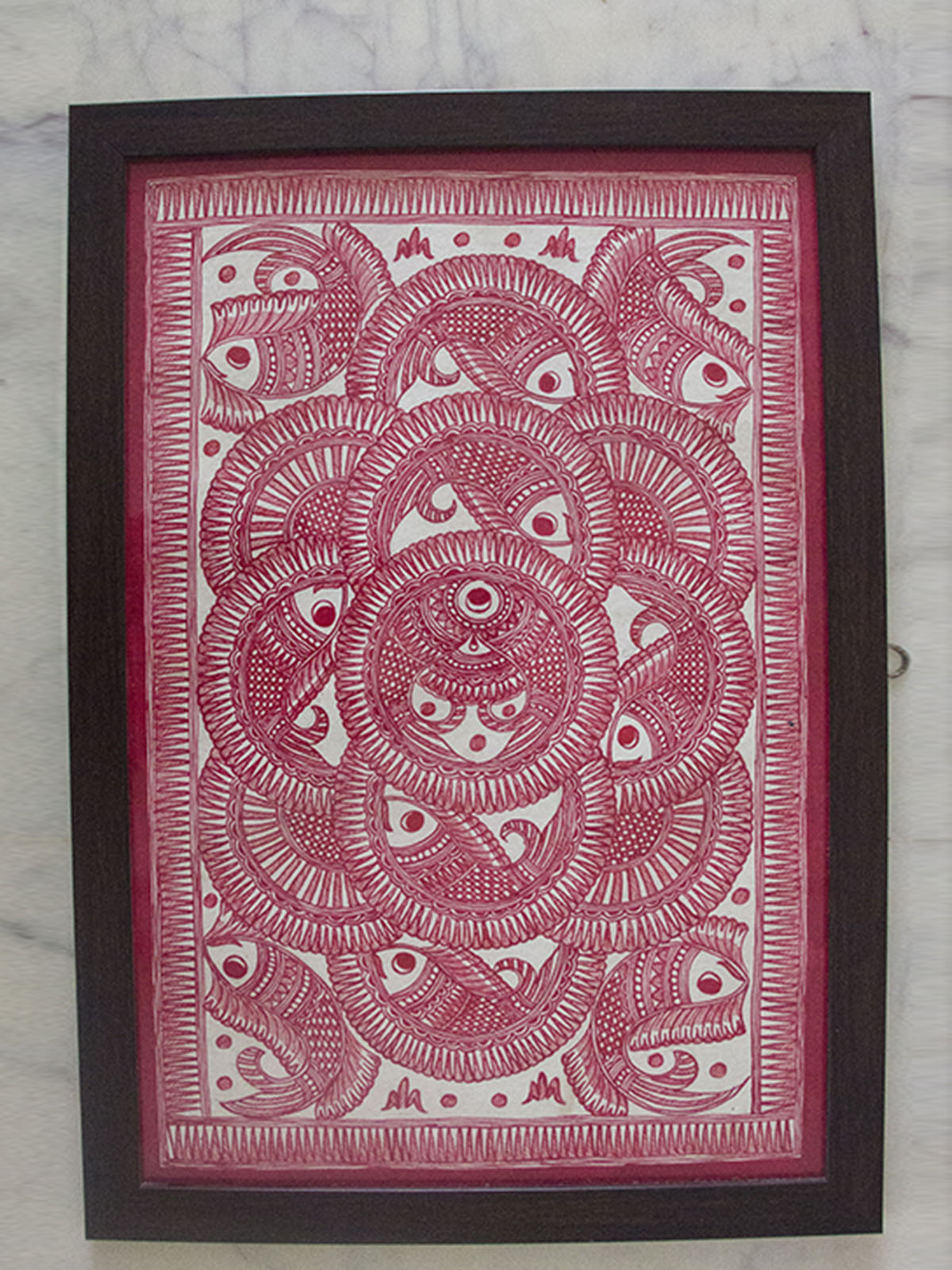 Hand-Painted On Handmade paper traditional Madhubani painting. Fishes are considered very auspicious in Mithila Culture and form a very important element of Madhubani Paintings. DIMENSION - 25 x 18 Inches. Shipped in 5-7 working Working Days if not a ready product.