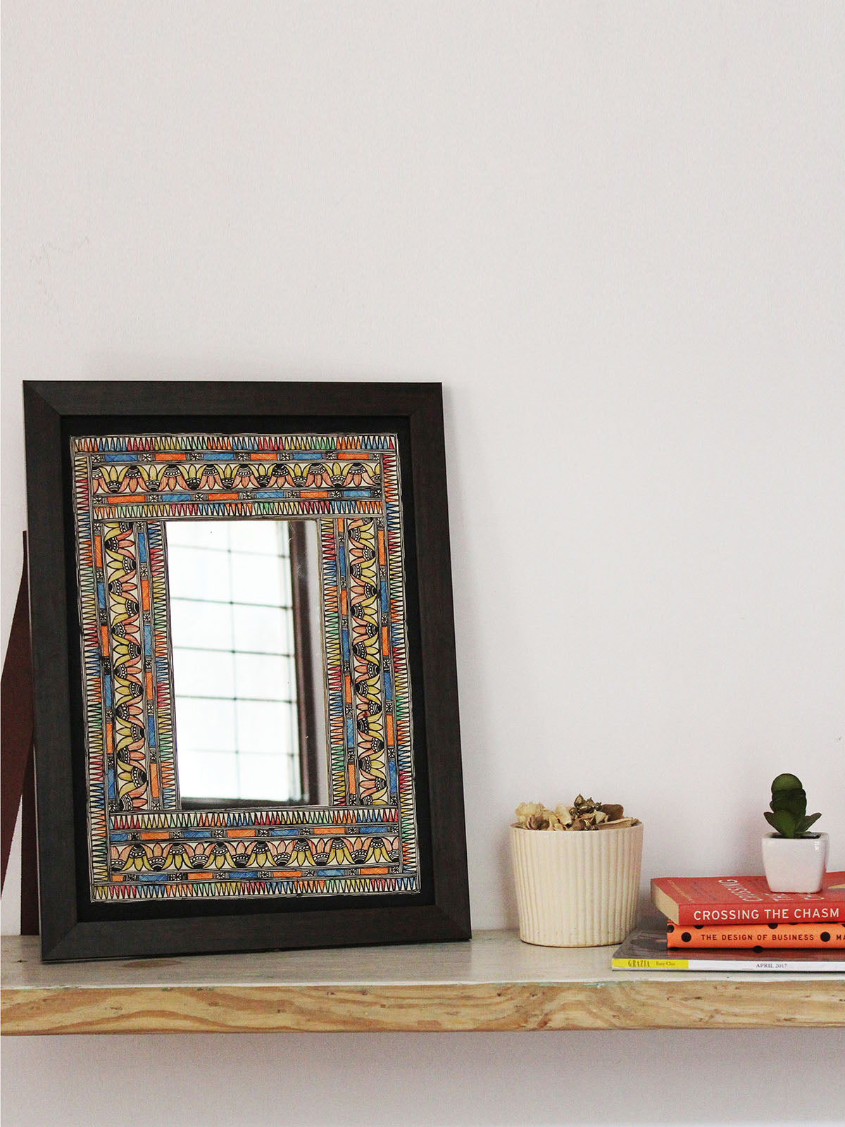 The handpainted Madhubani designs fosters an amalgamation of rich contemporary aesthetics with a composition that flourishes vibrancy. The hues are rich, and the detailing is exquisite, making it an absolute stunner for every affluent living space.Use it like a photo frame or as a mirror. DIMENSION - 20" X 14" frames are not part of the product.Paintings come on a mount board that can be framed. COLOR - MULTI. Shipped in 5-7 working Working Days if not a ready product.
