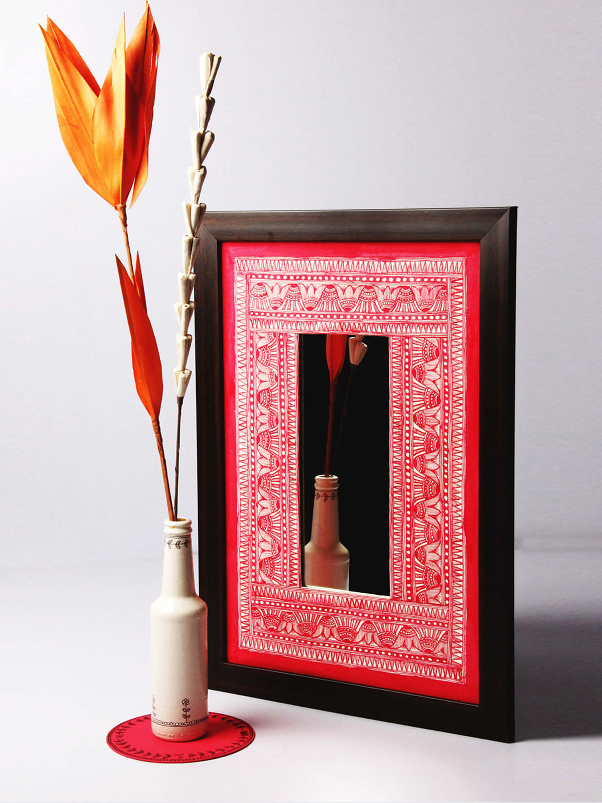 The handpainted Madhubani designs fosters an amalgamation of rich contemporary aesthetics with a composition that flourishes vibrancy. The hues are rich, and the detailing is exquisite, making it an absolute stunner for every affluent living space.Use it like a photo frame or as a mirror. DIMENSION - 20" X 14" NOTE: Frames are not part of the product.Paintings come on a mount board that can be framed. Shipped in 5-7 working Working Days if not a ready product.