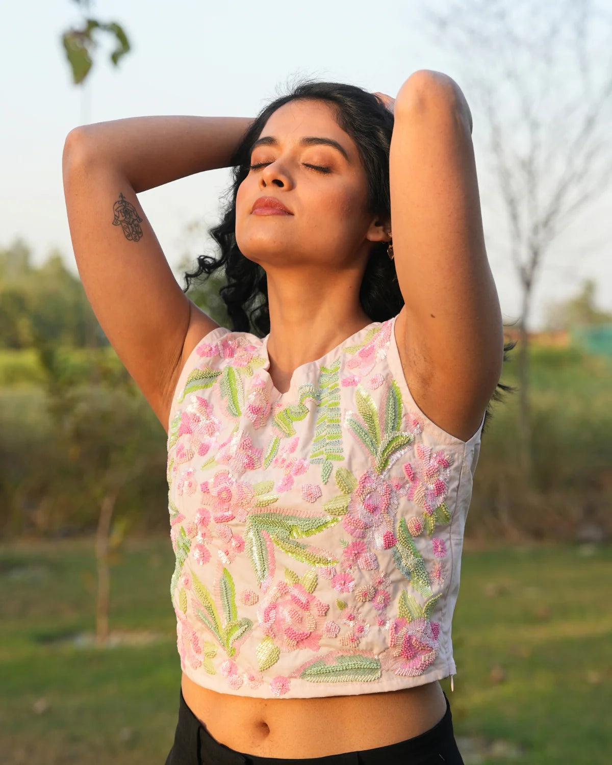 She is intricately embroidered blouse adorned with delicate threads and sparkling sequins. This ethereal piece will transport you into a magical fairytale, making you feel like a princess. Wear it with pants, skirts, or sarees and style it to your heart's desire. Elevate your wardrobe with Adhira.