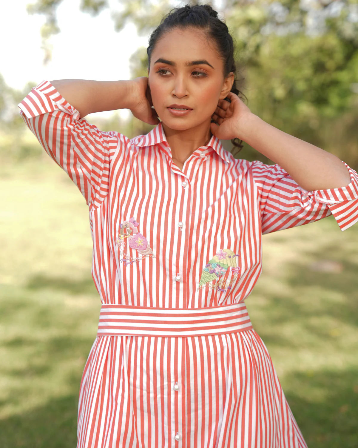 Get ready to turn heads with her, the super comfortable shirt dress adorned with charming hand embroidered birdies. Plus, we've got you covered with convenient pockets. Glam up your style with Elina today! Perfect for summer with elegant stripes, combining comfort and sophistication. Relaxed fit that offers a flattering, easy-going silhouette. Delicate hand-embroidered birds add an artisanal touch. Pearl button-down front for a refined, effortless look. 3/4 sleeves that can be rolled up for a polished, smart appearance. Classic collared neckline for a timeless, chic vibe.