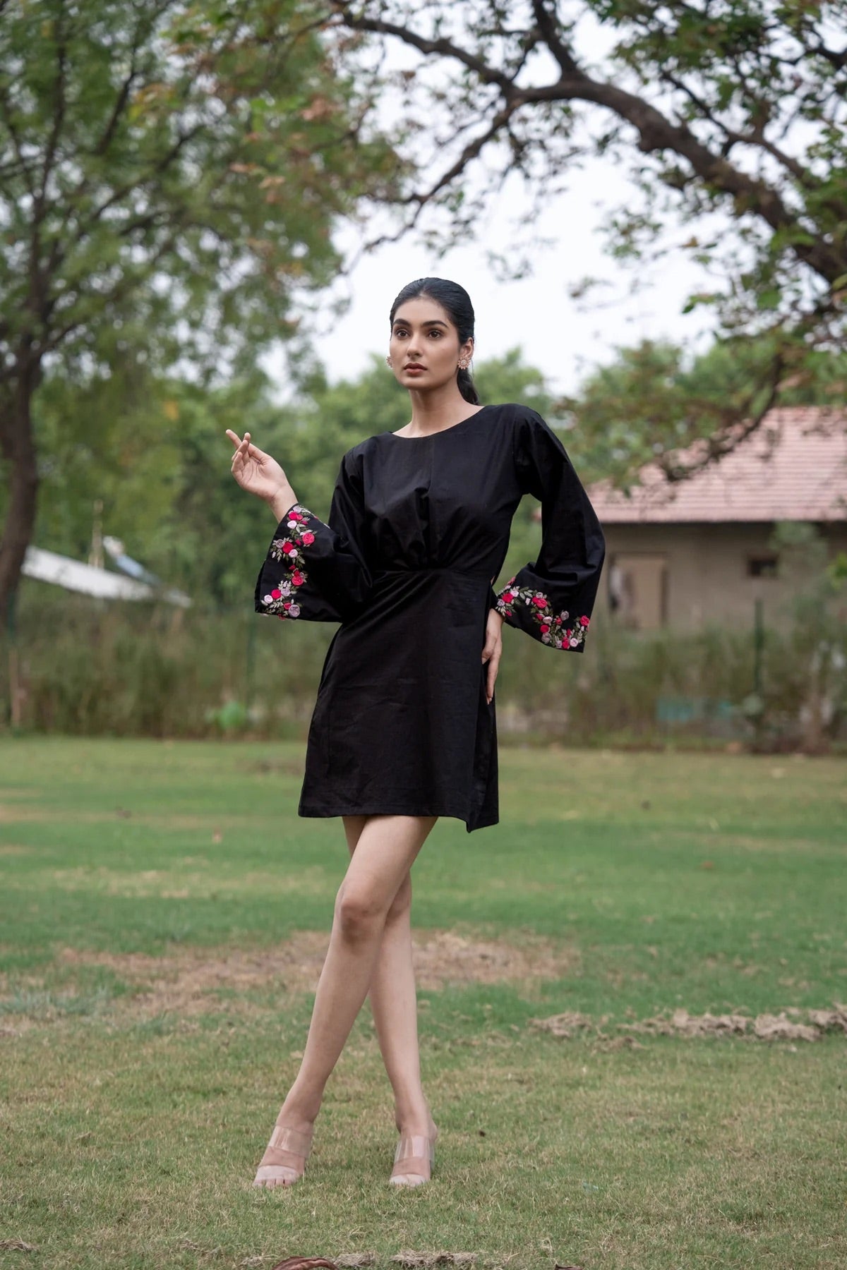 A tasteful black cotton dress featuring exquisite cotton thread embroidery on the sleeves. She is perfect for any occasion, it adds elegance and sophistication to your wardrobe. The convenient side pocket on this dress is perfect for carrying your essentials without sacrificing style. The intricate details and high-quality fabric make it a must-have for any fashionista. Elegant yet classy short dress with a modern silhouette. Small side cut-out at the waist for a playful, flirty touch. Bell sleeves adorned with exquisite embroidery, adding a graceful, artisanal detail. Round neckline for a clean, timeless finish. Back zip for ease and comfort.