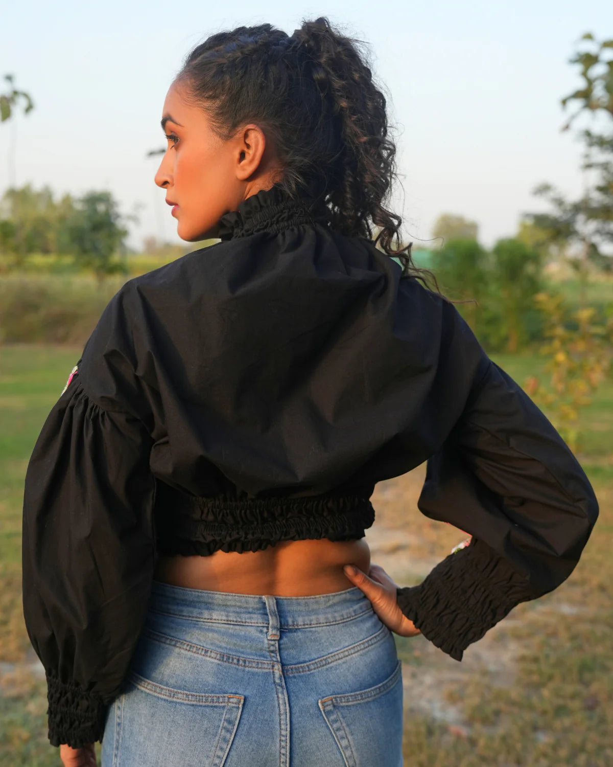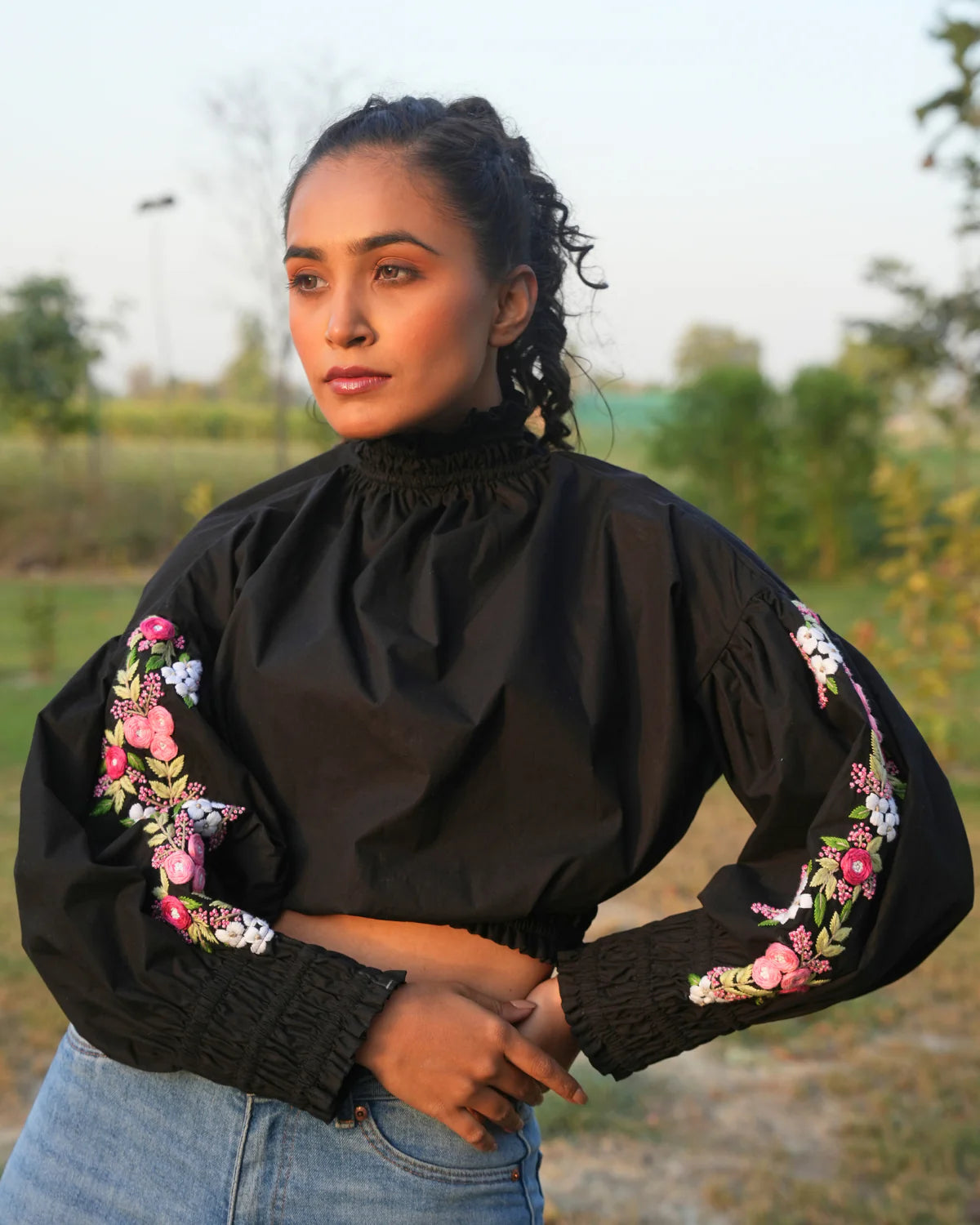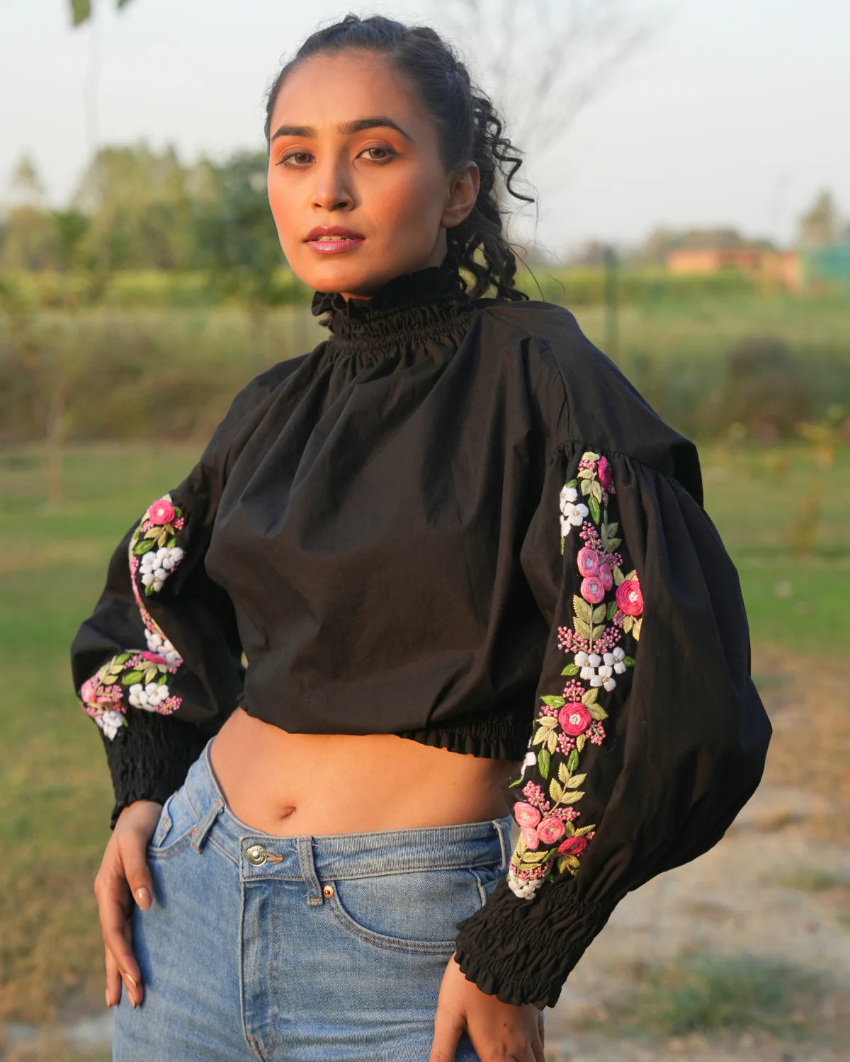 She is the high-neck crop top that's perfect for any occasion. Made with comfortable cotton and featuring unique embroidery on the sleeves, this top is stylish and versatile for both parties and casual wear.
