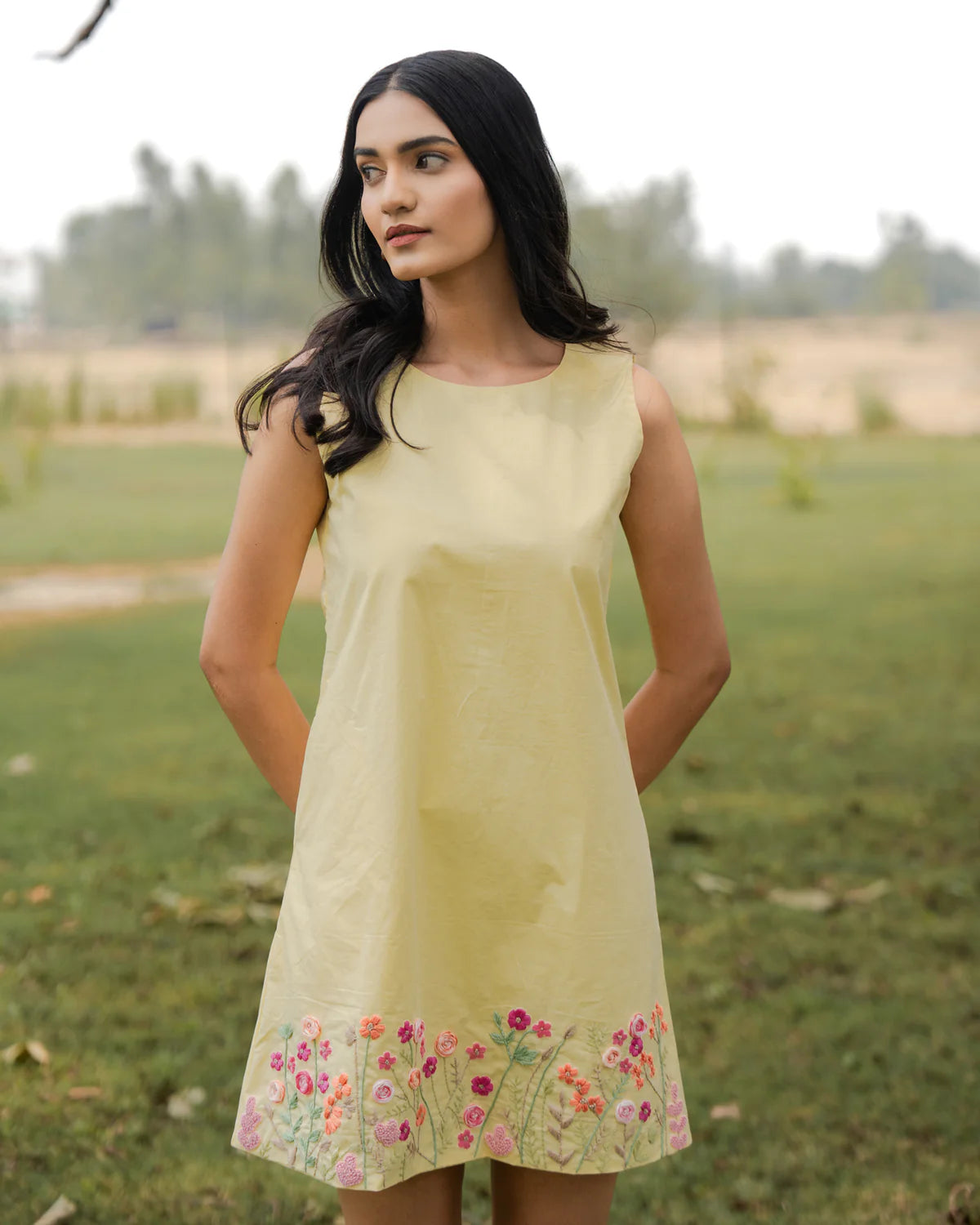 The modish and elegant cotton dress with cotton thread embroidery that adds a touch of sophistication to your wardrobe. convenient side pocket, making it perfect for on-the-go use. Made with high-quality materials, this classy piece is perfect for any occasion. Experience comfort and style with her. Charming short dress with a playful yet sophisticated feel. Zip for a smooth, tailored fit that flatters the silhouette. Hidden side pocket for seamless practicality and understated elegance. Sleeveless design, ideal for warm, sunlit days. V-neckline, offering a flattering and refined touch.