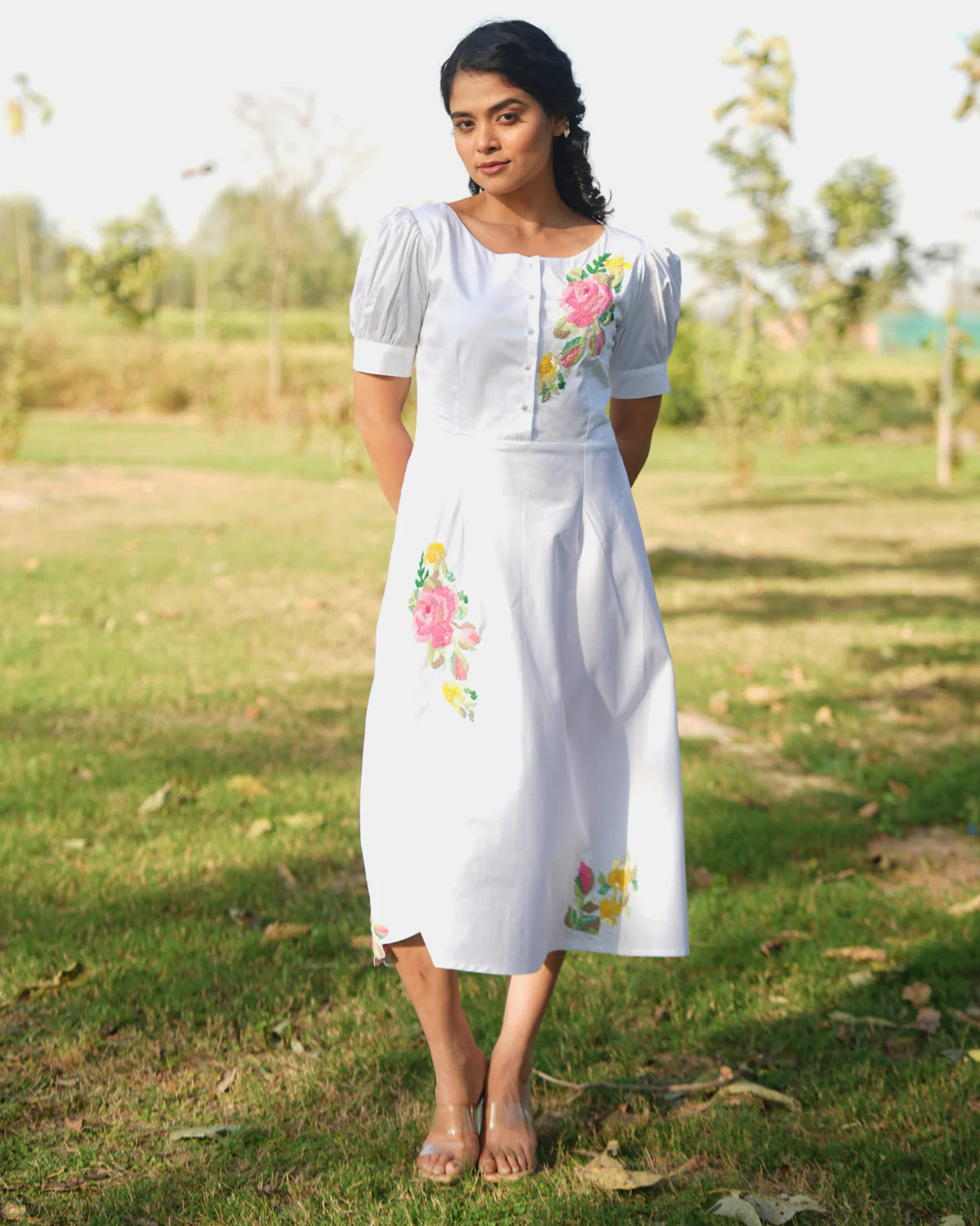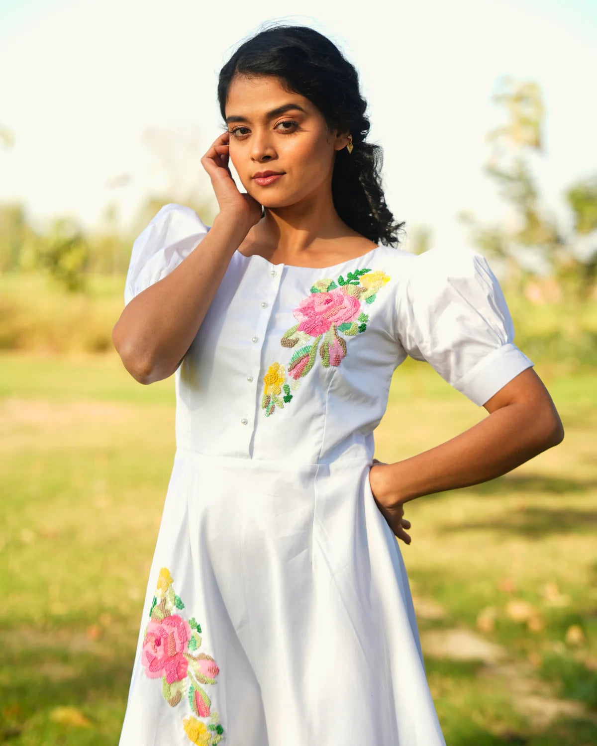 She is the epitome of classic summer style. Made from lightweight cotton with intricate cotton thread embroidery with a side pocket. She is a must-have piece will elevate any warm weather ensemble. Elegant midi dress with a flattering, timeless silhouette. Beautiful hand embroidery featuring threads and sequins for a touch of sparkle. Pearl button at the top, adding a refined and sophisticated finish. Hidden side pocket for seamless functionality and convenience. Short sleeves for a balanced, breezy feel. Round neckline for a clean, classic look.