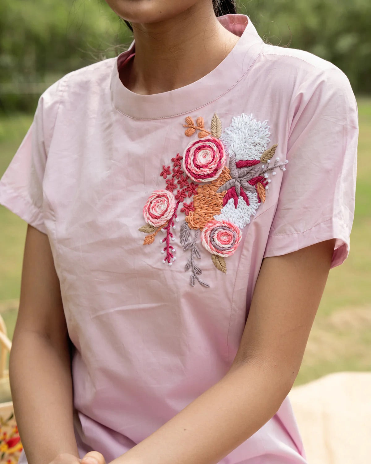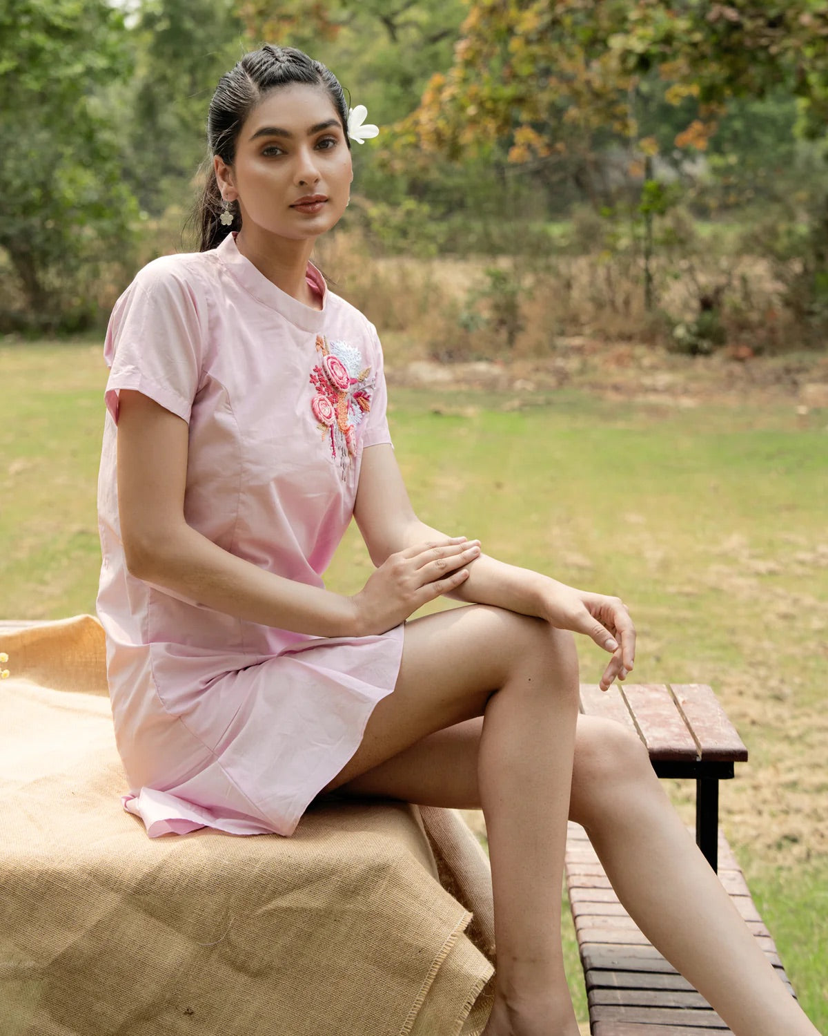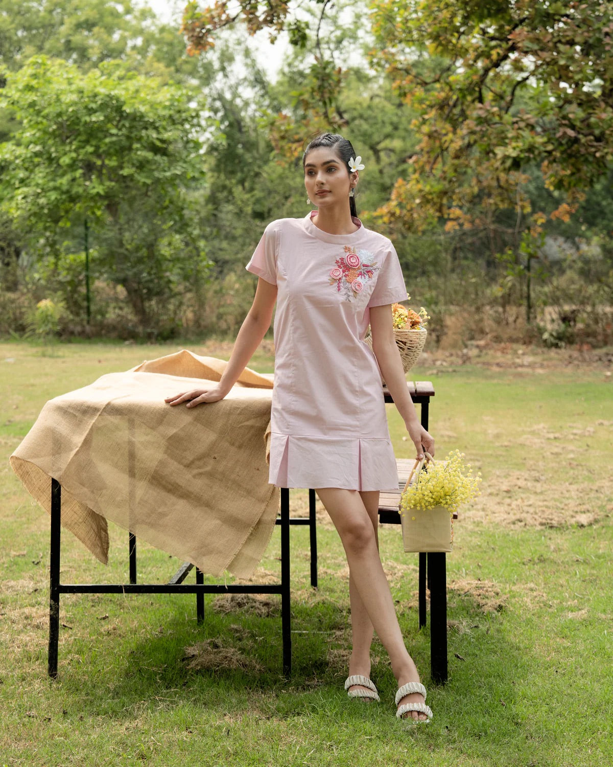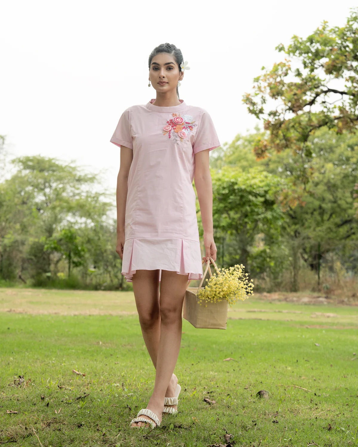 Elevate your style with her! This smart dress exudes luxury with its delicate cotton thread embroidery, making you feel like royalty. Say goodbye to fumbling through your bag with a convenient side pocket. This deluxe piece will elevate your wardrobe and turn heads. Feel confident and sophisticated in Joi. Cute short dress with a playful, flirty vibe. Soft broad pleats at the bottom add the charm. Side pocket for both convenience and understated style. Round neckline for a sweet, classic finish. Short sleeves for an easy, breezy summer look.