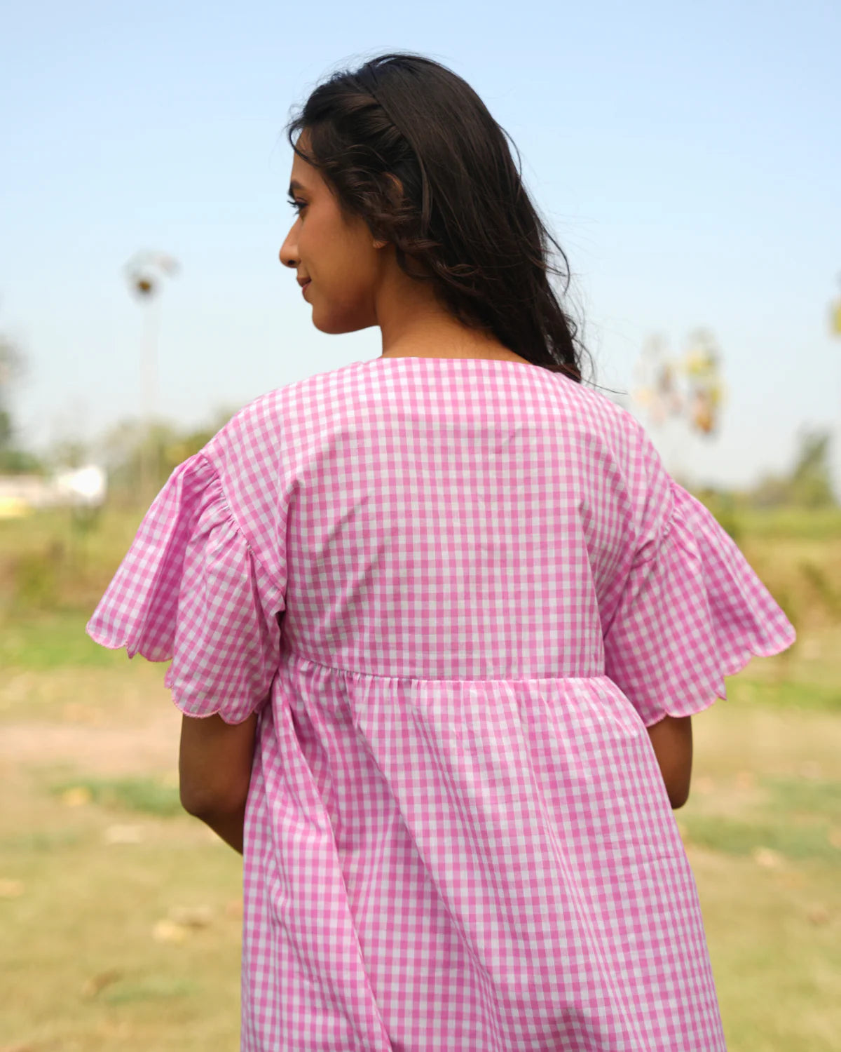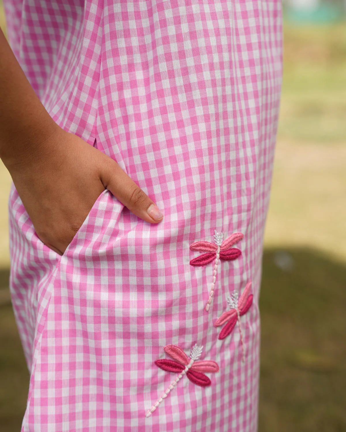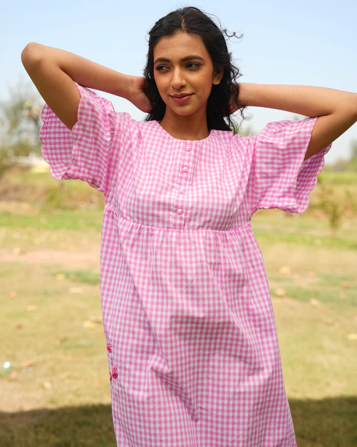 She is a bubbly short dress that takes comfort to the next level. Adorned with hand-embroidered dragon fly and convenient pocket, this dress is both cute and practical. Perfect for any occasion! Cute little mini dress, playful and effortlessly stylish. Relaxed fit with delicate scalloped hem for a charming finish. Short sleeves with flounce for a breezy, comfortable feel. Buttons at the top add ease and subtle detail. Round neckline for a clean, classic look. Side pocket for both functionality and understated charm.