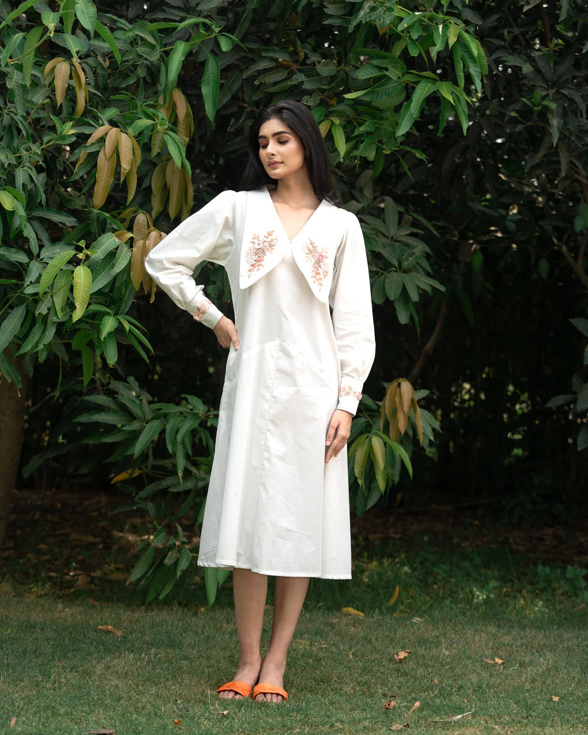 Expertly crafted from high-quality 100% cotton, she exudes timeless elegance. Its simple yet chic design boasts intricate cotton thread embroidery, making it the perfect addition to your wardrobe. She offers both style and convenience with its pocket design. Elevate your style effortlessly with this stunning dress. A graceful long dress, embodying timeless elegance with a flowing, refined silhouette. Side pocket for both practicality and a subtle, charming detail. Long sleeves adorned with delicate embroidery on the cuffs for an added touch of sophistication. Chelsea collar with beautiful embroidery, enhancing the dress with intricate artistry. Round neckline, exuding understated grace and poise.