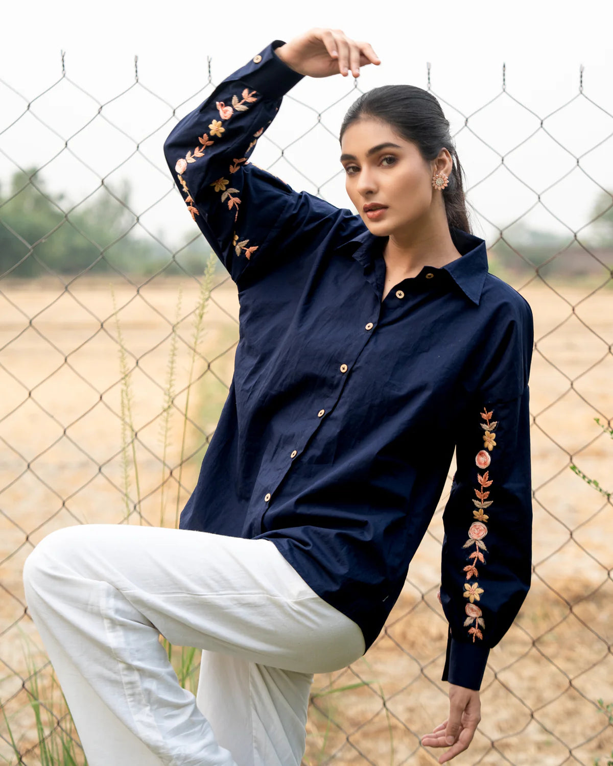 She’s the perfect cotton shirt for any occasion crafted with elegant thread embroidery on the sleeves for a refined touch. Lightweight and breathable, she transitions effortlessly from festive gatherings to casual days out, making her a versatile wardrobe essential that blends comfort with understated charm.