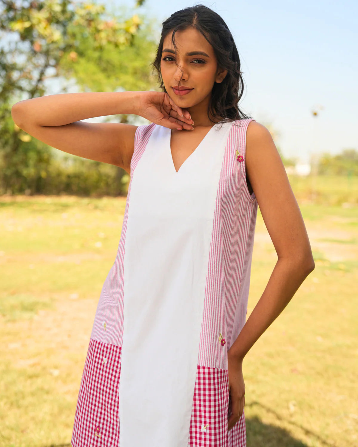 She is cute and stylish short dress featuring fancy side panels adorned with intricate hand embroidery, adding a chic touch of artistry. Perfect for those who love playful yet comfortable fashion, it’s a statement piece that’s both fun and refined. An easy, breezy mini dress designed for effortless summer days Striking colour block design with delicate hand-embroidered florals Sleeveless silhouette—perfect for sunlit outings and warm weather Concealed side zip ensures a smooth, tailored finish Flattering V-neckline adds a light, summery charm Side pockets for added functionality and convenience.