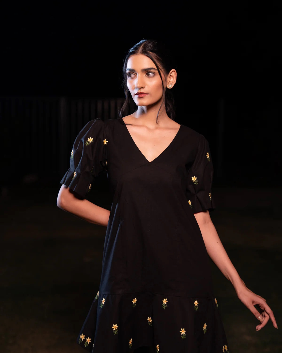 The perfect little black dress for any occasion. Rasika features beautiful embroidery on the bottom and the sleeves, adding a touch of elegance to your look. Maximize convenience with Rasika's side pocket feature. Made with comfortable cotton fabric, she is the perfect combination of style and comfort. Short dress that effortlessly combines elegance with a classy, timeless appeal. Pleats at the bottom, enhanced with delicate hand embroidery for a refined, artistic touch. Side pockets for both convenience and understated style. Puffed short sleeves, adding a soft, feminine silhouette. V-neckline for a flattering and sophisticated finish.