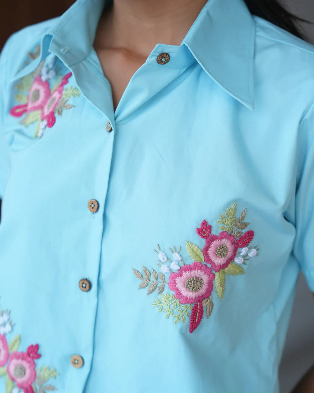 She’s an embroidered crop shirt designed to add a breezy, stylish flair to any outfit. Lightweight and effortlessly chic, this versatile piece can be dressed up or down with ease. Pair it with skirts, shorts, or trousers—she’s the go-to choice for sunny days, casual outings, or spontaneous adventures.