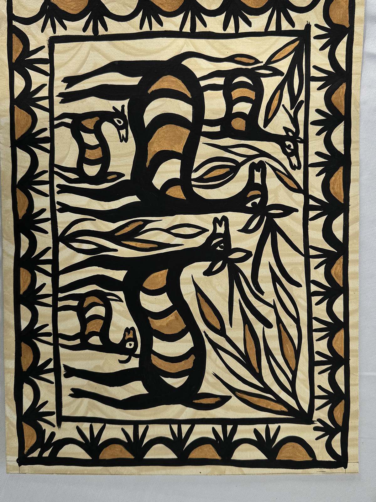 Created using natural soil-based colors like red and yellow ochre, white clay, and black manganese, the artwork is traditionally painted directly on mud surfaces. This piece, made on handmade paper with a mud base, features intricate depictions of animals, plants, and symbolic geometric patterns, reflecting themes of fertility, prosperity, and a profound connection to nature. A timeless tribute to indigenous artistry, it brings warmth and cultural depth to any space.