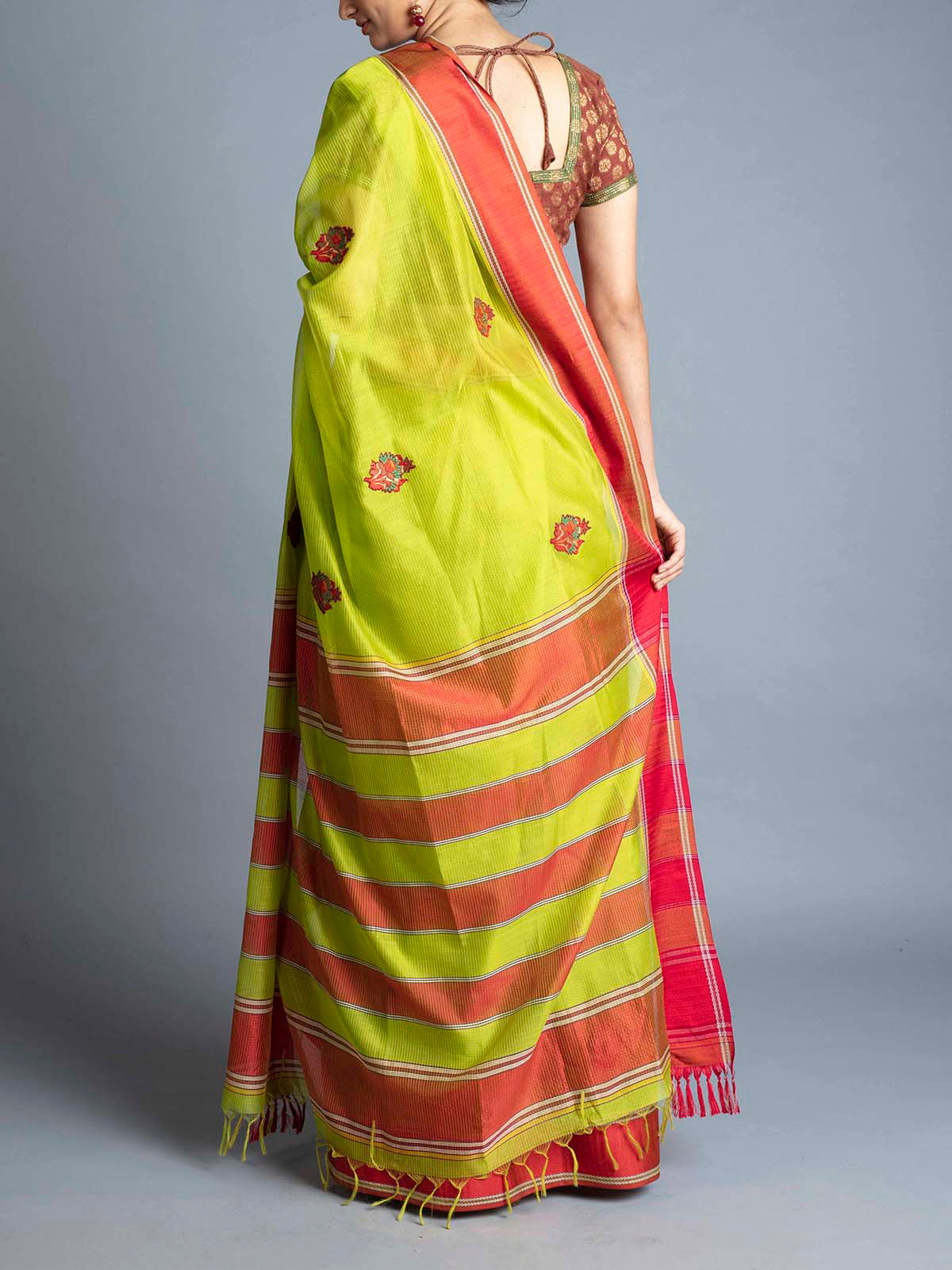 Handwoven by weavers in Maheshwar, this saree has a herringbone border with Banarasi patchwork. It is complimented with a Mashru blouse.